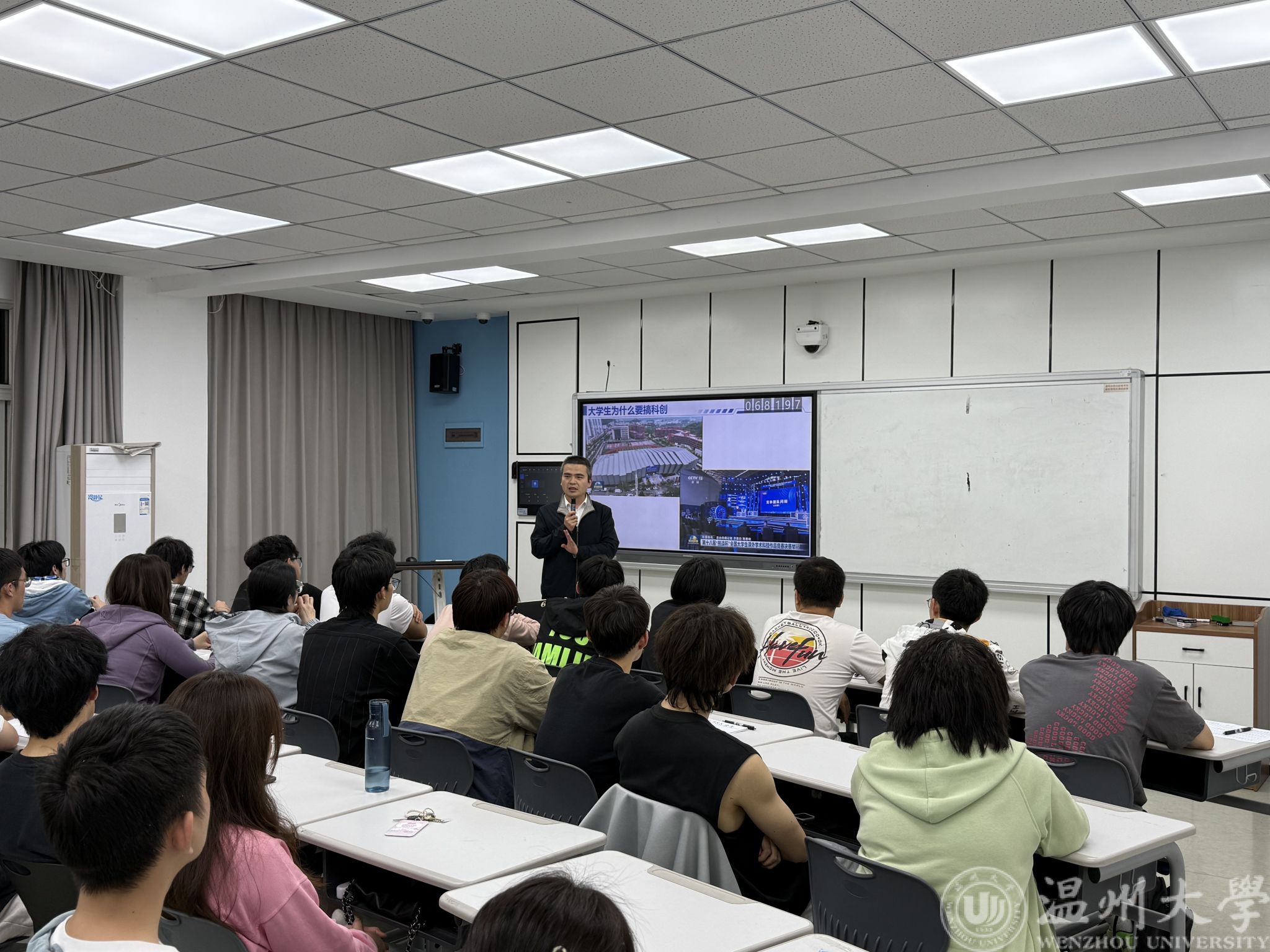剖析典型案例,领略科创魅力。为加深同学们对科创的认识,舒院长分享了多个成功的科创项目案例。在新能源与电能变换项目中,学生搭建 20 千瓦平台,运用脉宽调制技术攻克电能变换中的谐波干扰难题;断路器保护特性测试装置项目里,学生运用电源系统知识与编程技术,实现对断路器保护特性的精准校验;非侵入式电压传感检测技术项目中,学生基于电场感应原理,通过算法优化解决测量误差问题,并成功发表 SCI 期刊文章;在面向批量化制造的断路器全流程数字孪生车间系统项目中,学生凭借出色的项目策划与技术攻关,斩获全国大学生课外作品竞赛特等奖。这些科创竞赛和项目成果的展示,让学生们感受到了科创的无限魅力。