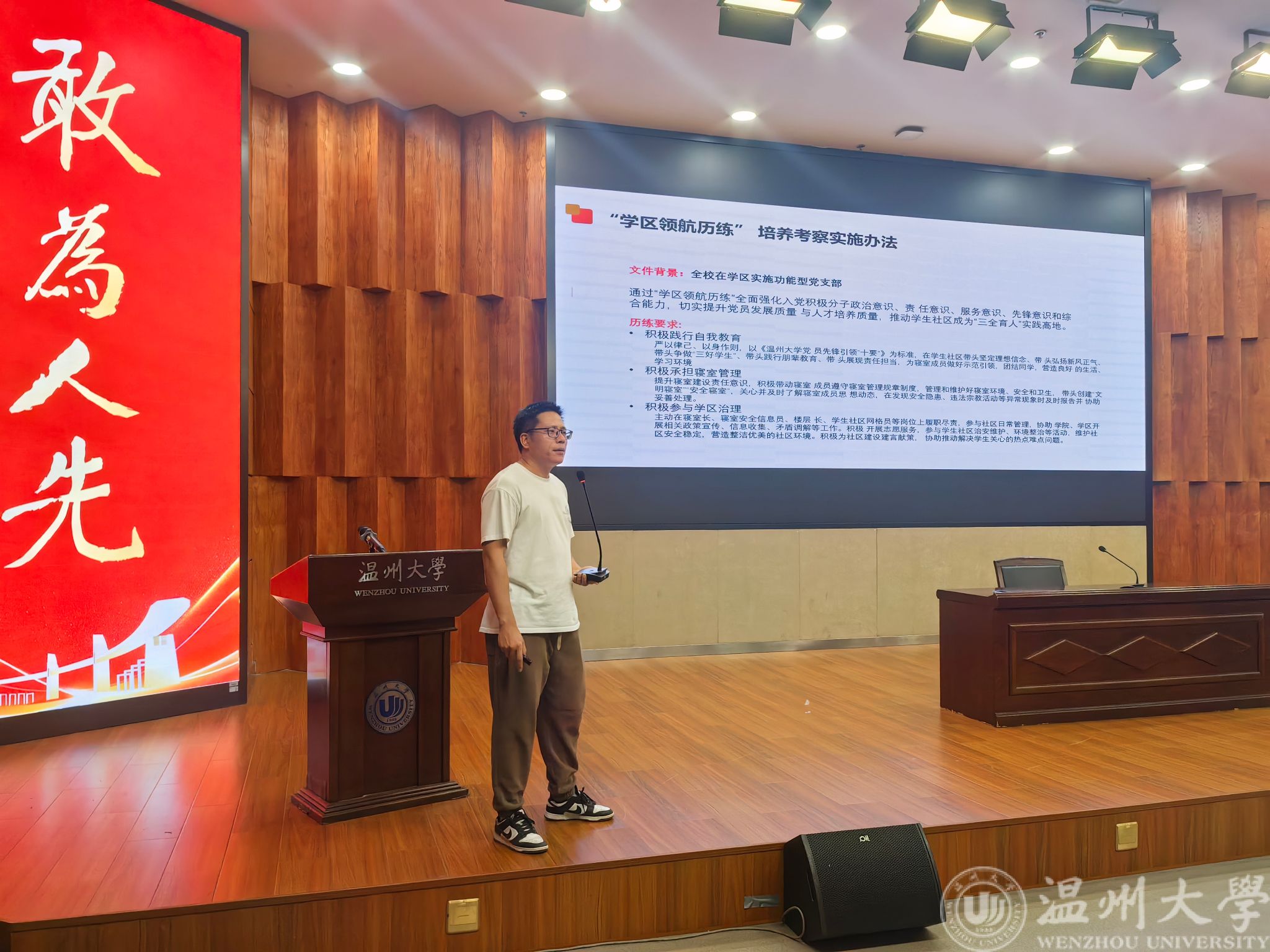 党员大会结束后,紧接着召开了全体积极分子教育大会。会上强调了入党积极分子在“学区领航历练”中的重要任务,包括自我教育、寝室管理、学区治理等方面的具体要求,如积极向党组织靠拢,带头践行《温州大学党员先锋引领“十要”》,在学生社区做好示范引领,带动身边同学共同进步。同时,对入党积极分子的义工服务、学习时长及思想汇报等培养考察要求进行了详细说明,确保积极分子在思想和行动上向党组织靠拢。