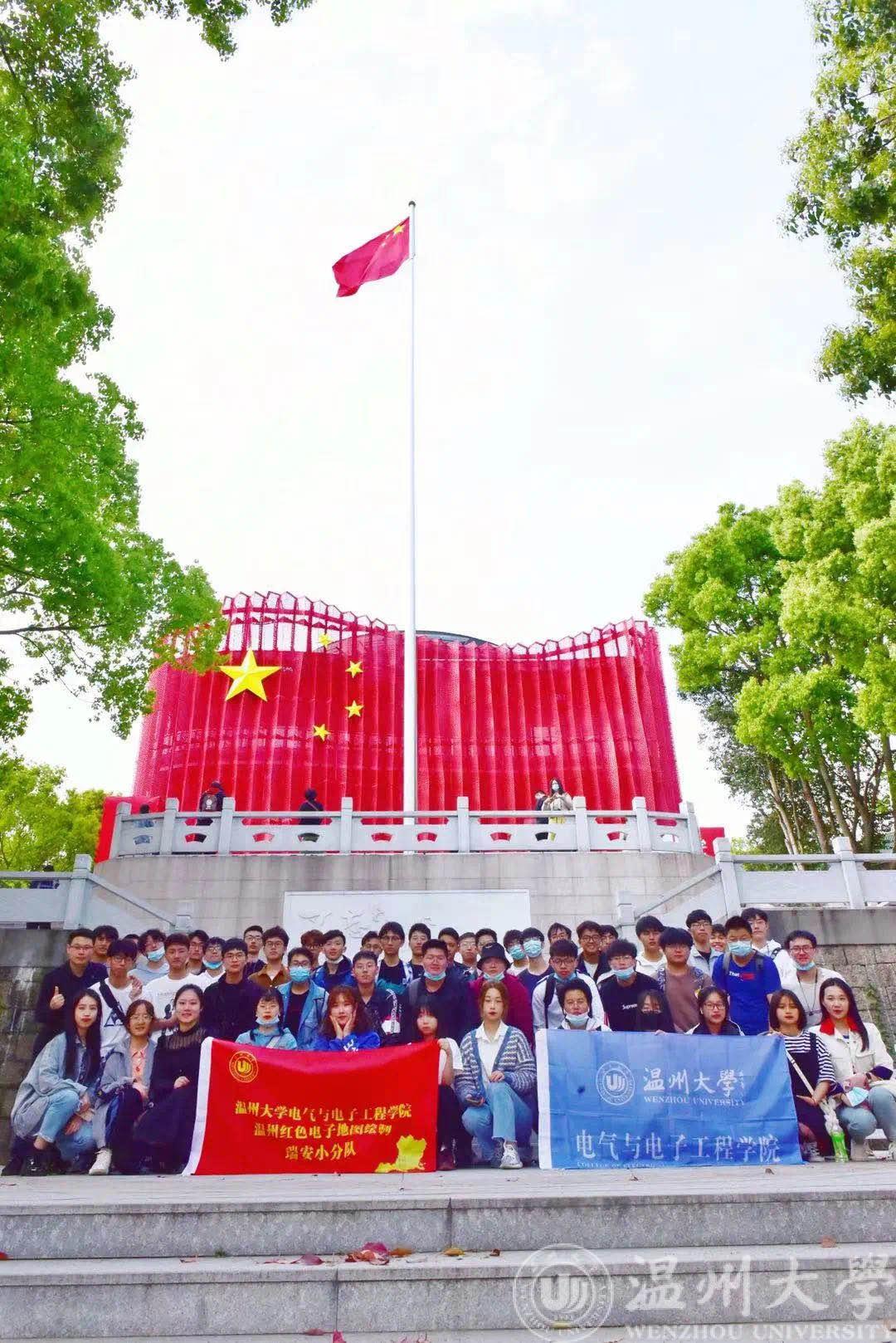 下午13:10,活动正式开始。团学成员们携带横幅,前往国旗广场,怀着激动的心情,认真听取曾蓓蕾书记对大家的期待和建议。曾书记提出,此次新青年下乡是2021年度红色实践活动的开始,希望同学们认真对待,并在今后的道路上发挥自己的专业特长,为社区建设做一份贡献。曾书记讲话完毕后,团学成员于温州大学东大门,乘车前往瑞安。下午14:00左右,团队抵达瑞安国旗馆。馆内陈列了中国各个时期的文献以及照片资料,团学成员们怀着认真学习的态度,将馆内每层陈设的物件一一观摩。国旗馆之旅使团学成员们对国旗背后的故事有了更深层次的了解。参观完毕后,大家在馆外进行了合影留念。14:50左右,我们抵达了第二站——烈士陵园。在陵园内,我们通过参观文献记录学习革命历史,并以默哀一分钟的方式缅怀先烈。
