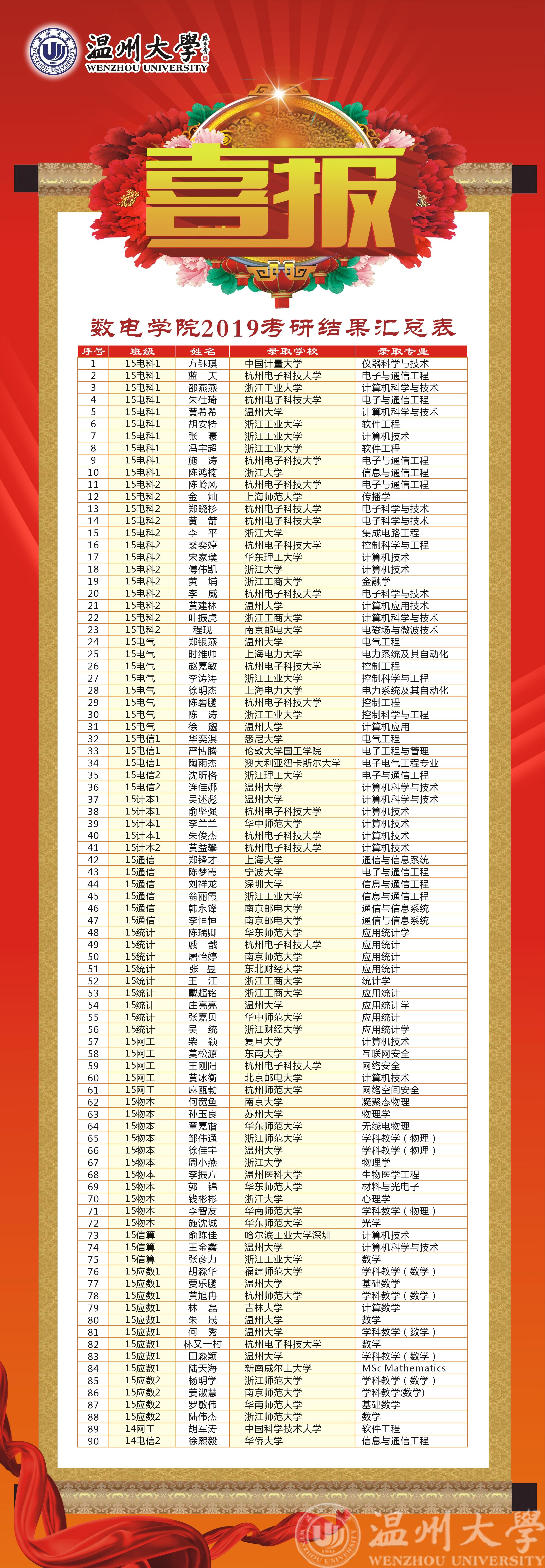 在球探体育比分网 学子不懈奋斗中和全院老师的关心、指导下,2019届毕业生在研究生入学考试中,共有88人成功考取了浙江大学、复旦大学、南京大学、东南大学等国内外知名院校研究生,录取率突破14.5%。在此全院师生共同祝贺同学们取得的优异成绩,并预祝他们在今后的求学路上再创辉煌!