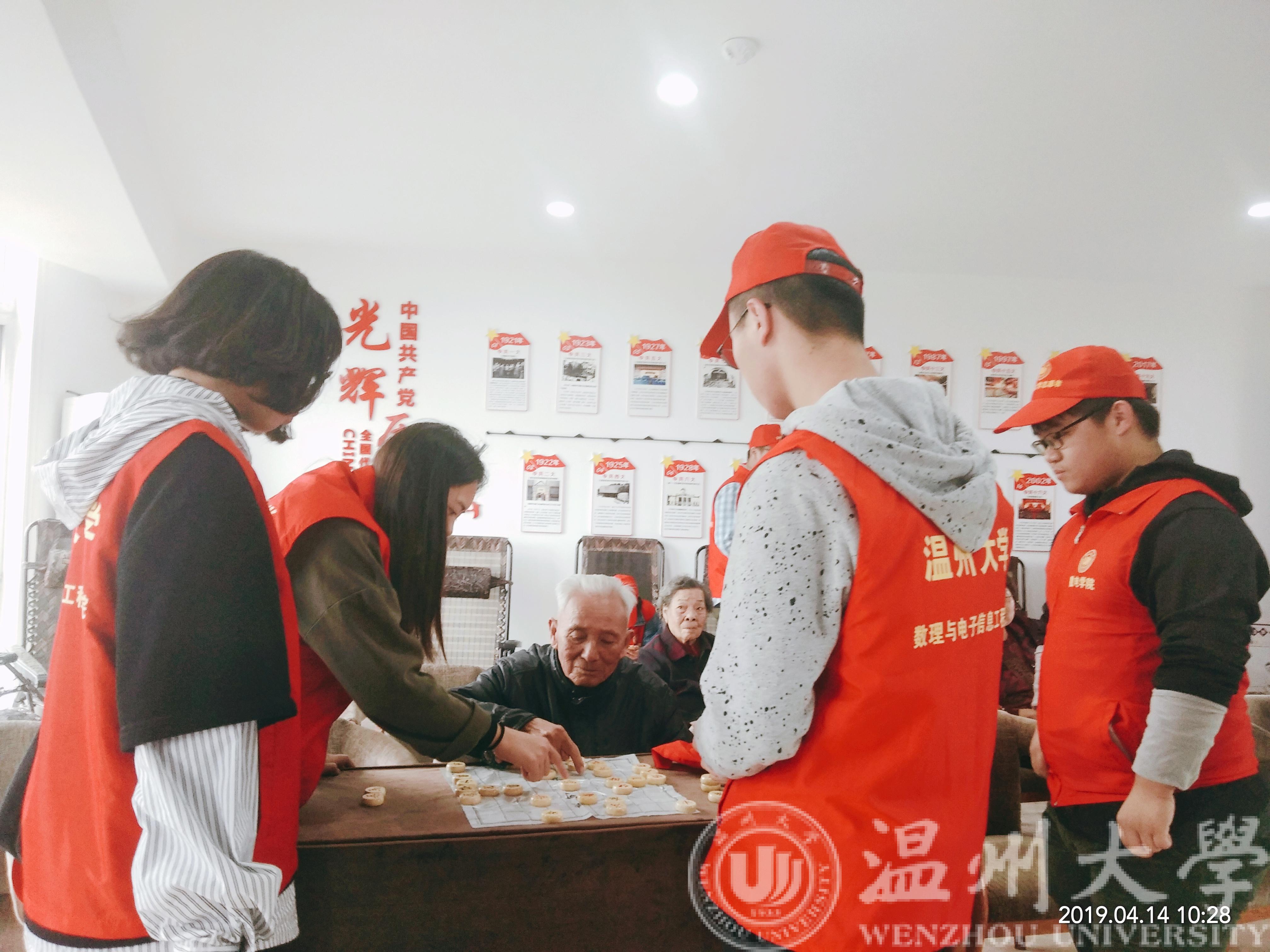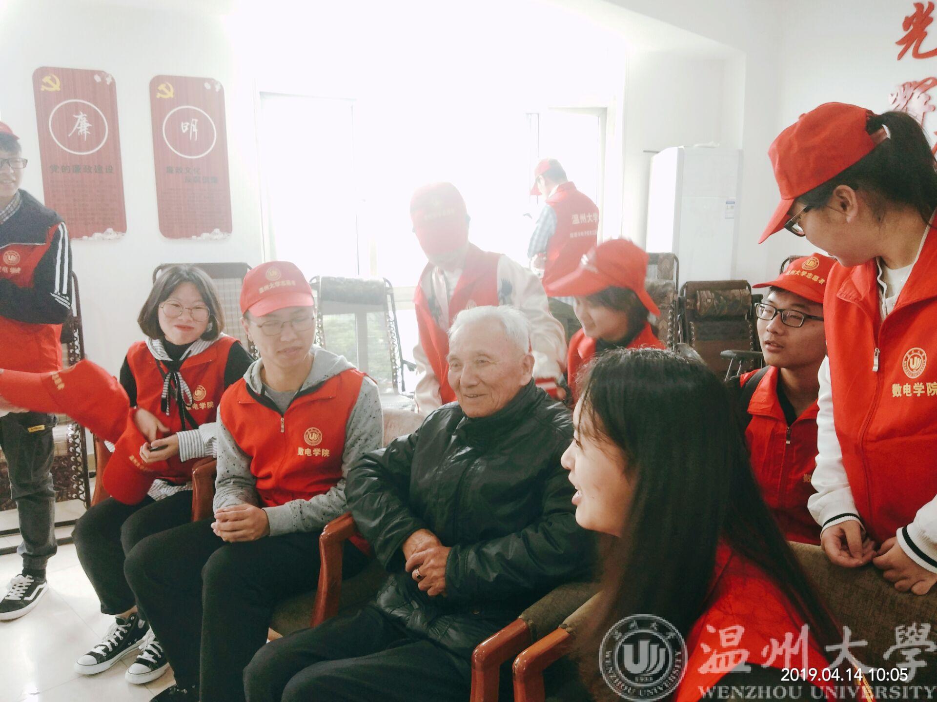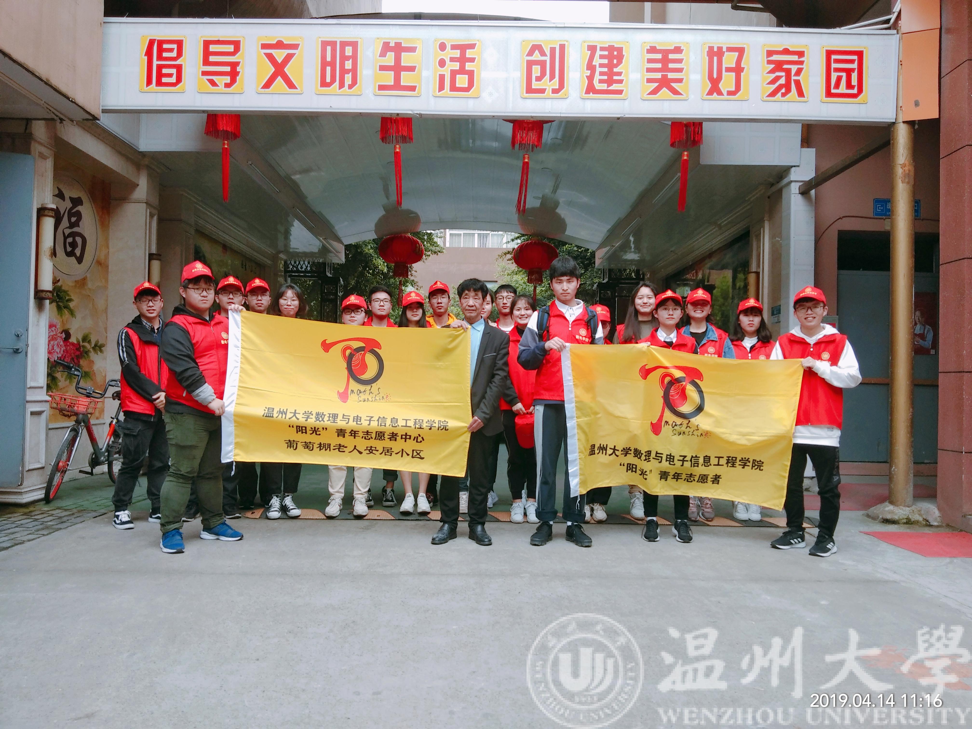 2019年4月14日,温州大学数理与电子信息工程球探足球 “阳光”青年志愿者中心组织了18电科1班的18名志愿者前往葡萄棚老人安居小区,为那里的老人送去了关爱与温暖。