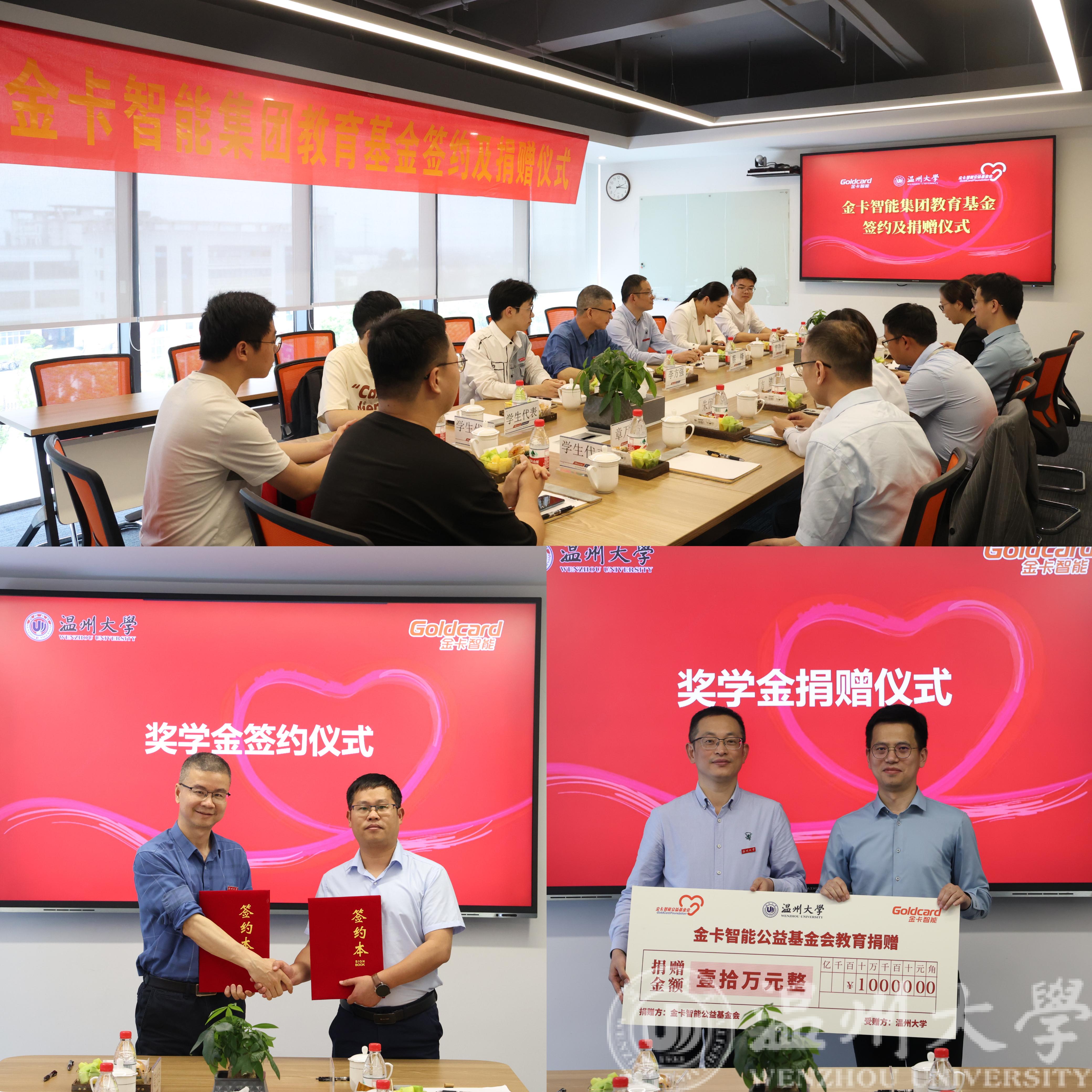 随后,双方在公司会议室举行交流会。交流会上李方强书记就温州大学和球探体育比分网 的基本情况做了详细的介绍。李书记感谢天信仪表和金卡智能为球探体育比分网 学子提供了非常优质的就业平台,并指出将来校企之间不仅可以在毕业生招聘方面沟通交流,还可以在专业培养、产学研合作等多领域开展深入合作。金卡集团天信仪表党委副书记黄曙华介绍了金卡智能集团主动履行社会责任,积极投身公益事业,组织一系列文明关爱、扶贫济困、奉献爱心等活动情况。在会议上,校企双方进行了金卡智能公益基金会温大奖学金签约仪式与捐赠仪式,每年设立10万元奖学金奖励品学兼优温大学子。会上,招生就业处蔡锋处长与现任集团副总裁的球探体育比分网 05届校友朱央洲和技术工艺部工程师、10届校友章万安等校友代表做了深入交流。据悉,目前该公司共有17名温大毕业生在各个岗位工作,蔡处长向校友们深入了解了一线就业需求。