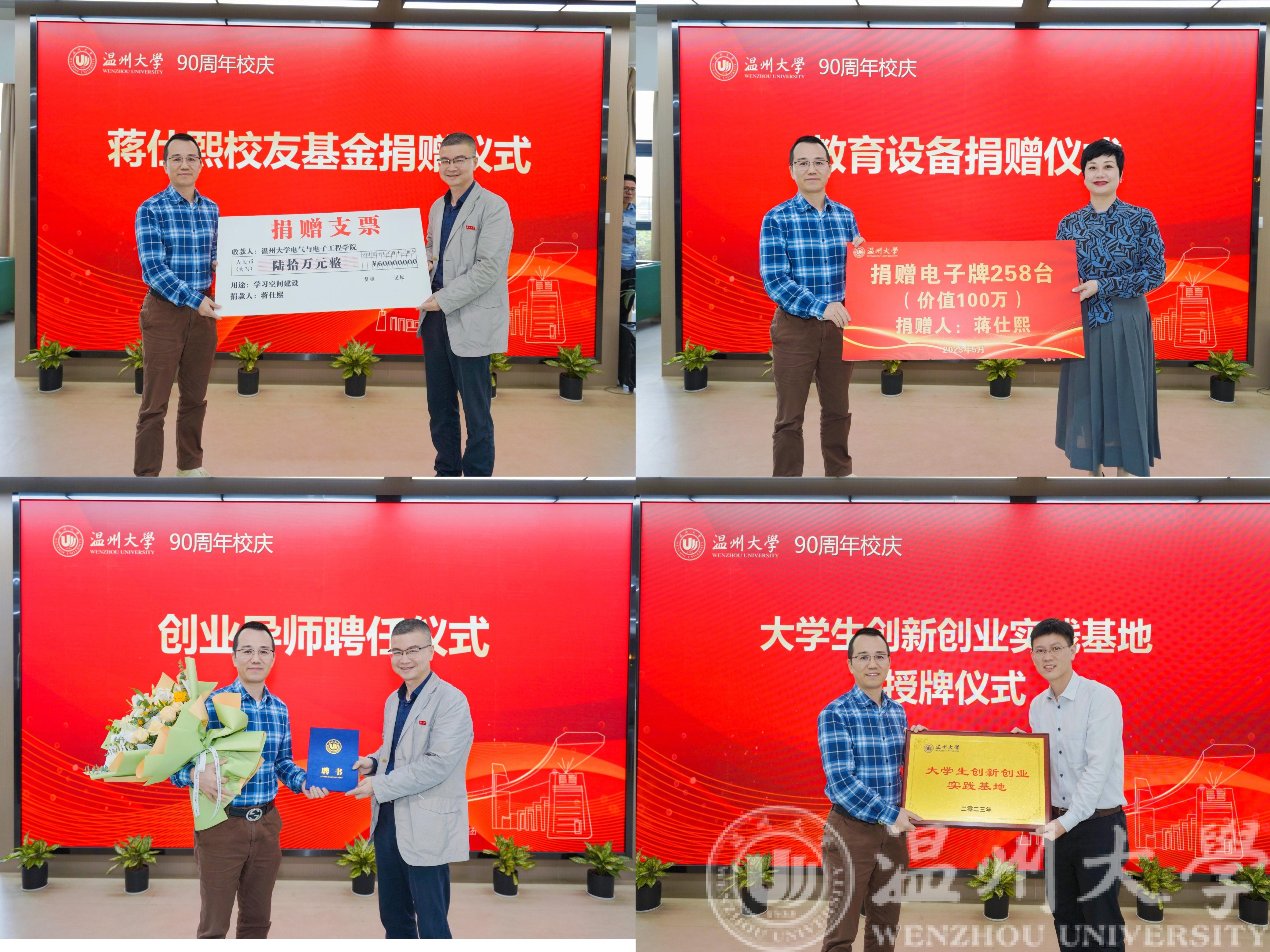 在现场各位嘉宾的共同见证下,蒋仕熙校友与李方强书记和张若妤处长进行了隆重的基金捐赠与教育设备捐赠仪式。与此同时,球探体育比分网 还聘请蒋仕熙校友担任我校创业导师,并授予蒋仕熙校友的企业为我校大学生创新创业实践基地。