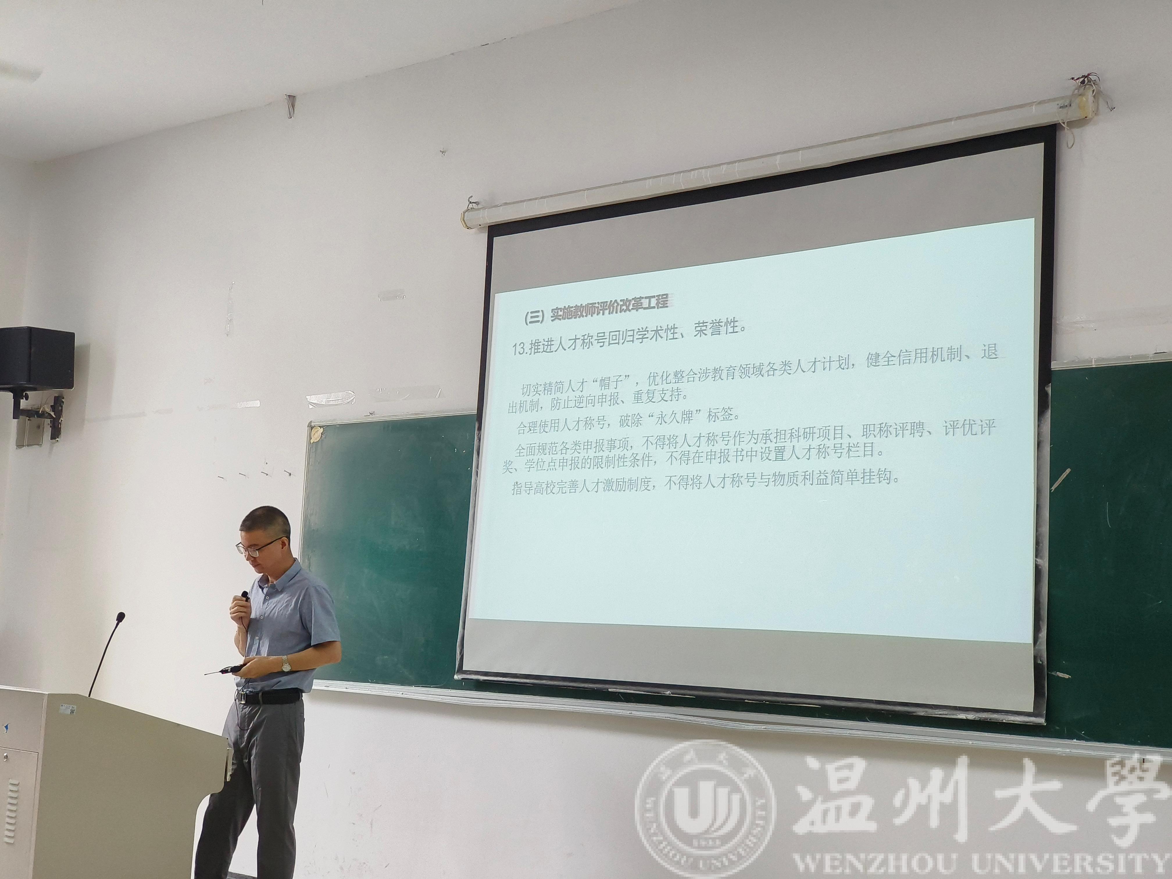 最后,党委书记李方强带领全体教职工对《浙江省深化新时代教育评价改革实施方案》进行了理论学习。主要介绍了学校、教师、学生与用人评价改革工程的内容,重点阐释了改进高等学校评价、改进高校教师科研评价等要点,并结合教育评价改革实施方案,再次强调了师德师风问题的重要性,希望各位老师密切关注,积极学习。