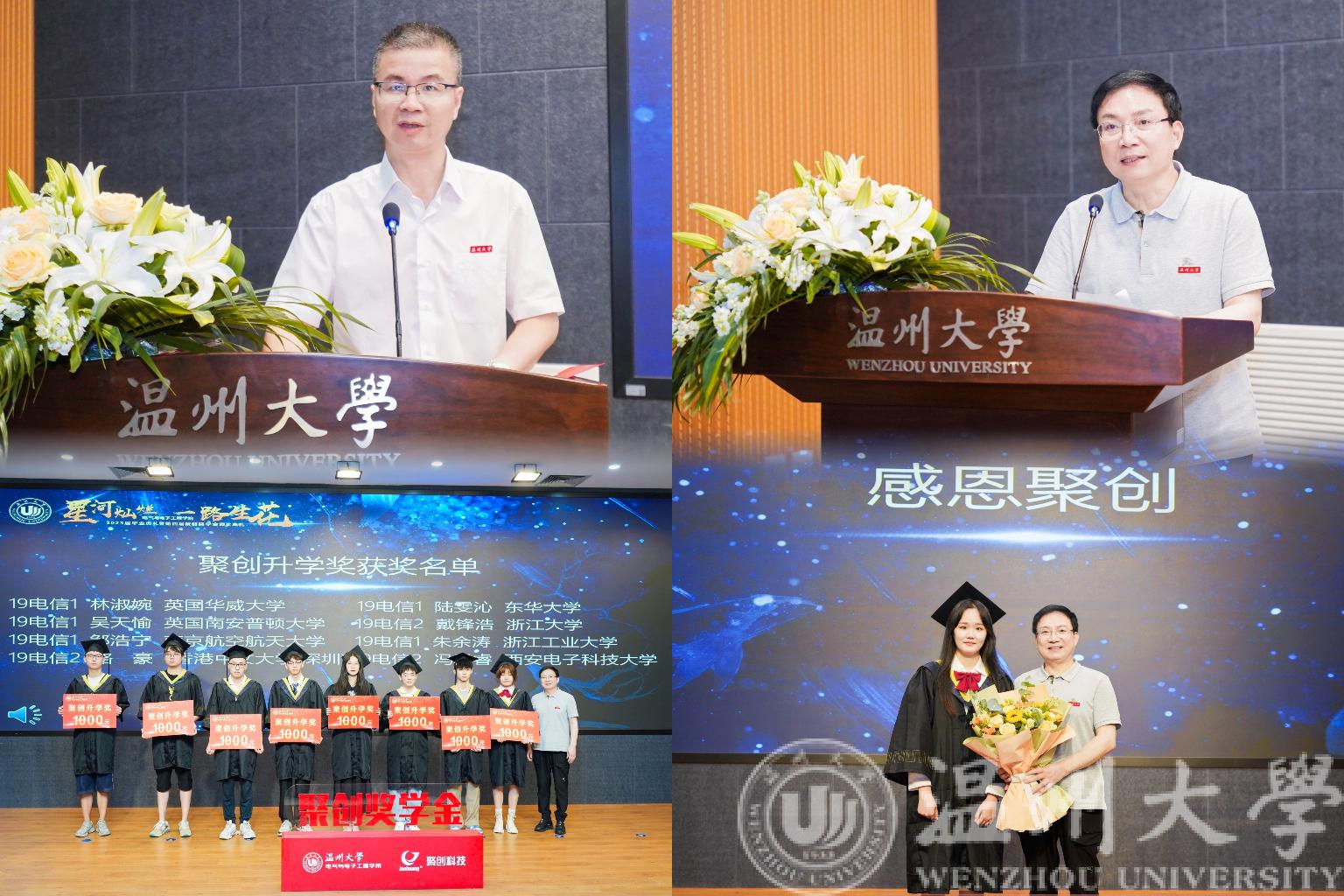 为表彰先进,在校友企业浙江聚创智能科技公司的赞助下,球探足球 特别设立聚创奖学金。毕业典礼仪式上,球探足球 党委书记李方强宣读了《2023年聚创升学奖奖励决定》文件及名单。聚创奖学金发起人吴桂初先生为获得聚创升学奖的68位毕业生代表颁奖。随后,曾担任球探足球 学生会主席、成功考取西安电子科技大学硕士研究生的省优毕业生缪安琪同学为吴桂初教授献花并表达感谢。