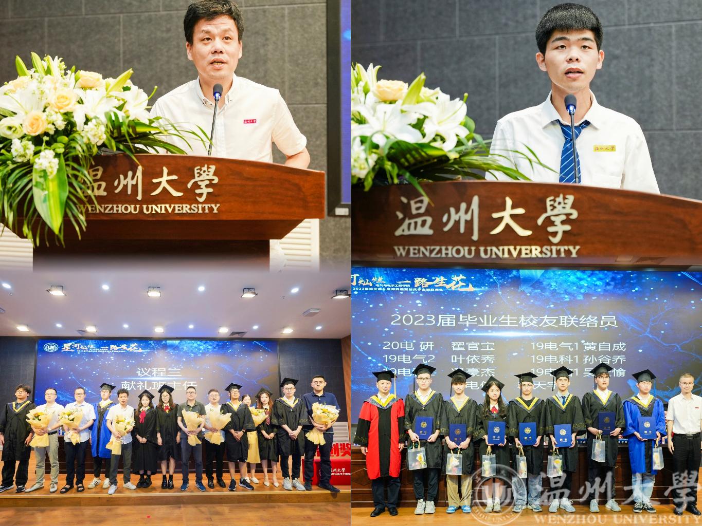 随后,各毕业班学生代表手捧鲜花,献给他们入学三四年来辛勤付出的班主任老师。伴随温馨的音乐响起,学生代表们向班主任老师行谢师礼。感恩献花仪式后,19电气2班班主任周志立老师和20电气工程(研)谢远峰同学分别作为师生代表上台发言。典礼上还为省校优同学颁发了荣誉证书,为各位校友联络员颁发了聘书。期间还观看了由球探足球 领导、2023届毕业班班主任、学弟学妹们为毕业生们录制的祝福视频。一张张熟悉的面孔,一个个亲切的笑容,一句句温暖的祝福,为各位毕业生增添前行的力量,激励他们以无畏的勇气探索浩瀚星空。
