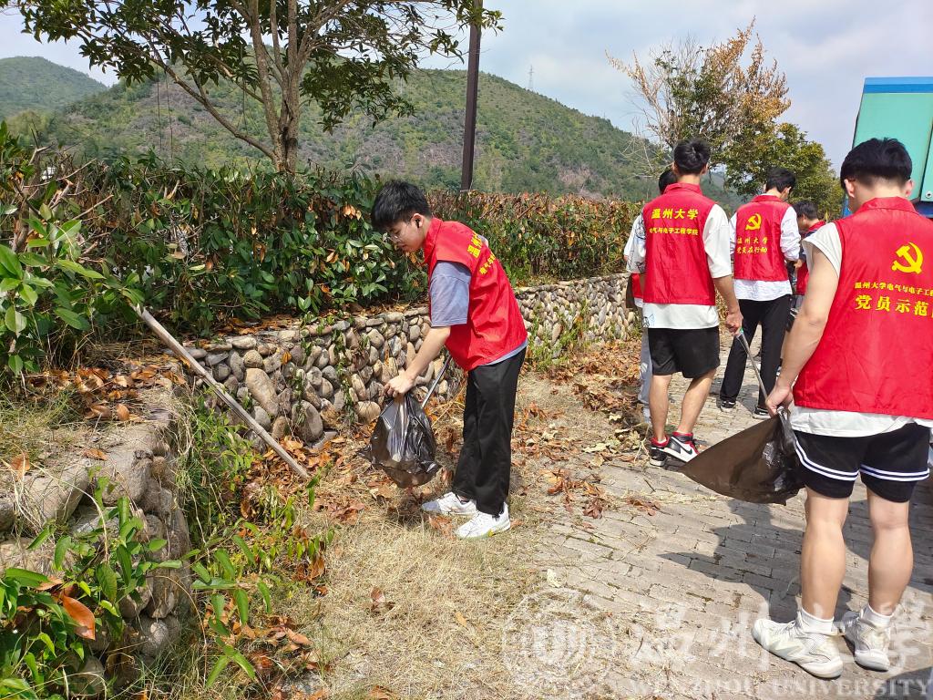 美化环境先行动,清洁环境惠民生。在大若岩镇白泉村,支部教师和青年学生志愿者沿着美丽的楠溪江一路前行,一步一净,一步一景。拾起一片垃圾,留下一份心意。经过教师党员和青年志愿者的辛勤劳动,楠溪江边的垃圾都消失了,收到的是在江边纳凉休闲村民们的句句赞扬。教师党员和青年学生志愿者经过本次锻炼,不仅培养了吃苦耐劳的精神,更收获了人民群众的肯定,打造了温州大学美丽的名片。