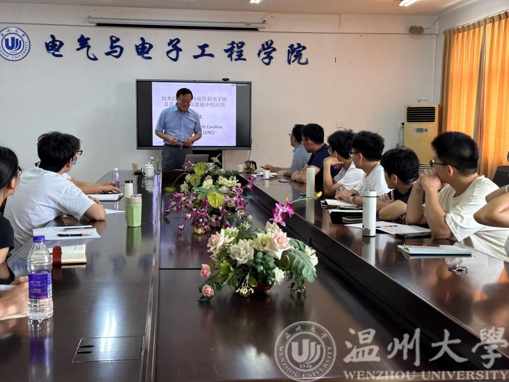 2023年7月4-5日,美国北卡大学教堂山分校物理及天文系秦禄昌教授到访温州大学,参观了球探体育比分网 浙江省光电功能器件与数字化检测国际科技合作基地及温州市微纳光电器件重点实验室,并做学术报告。