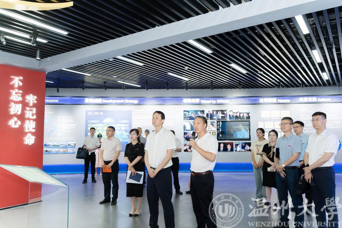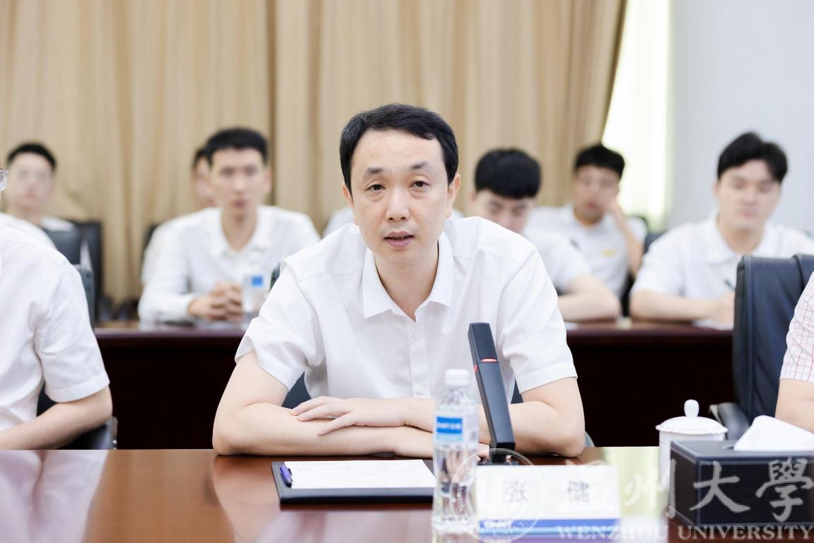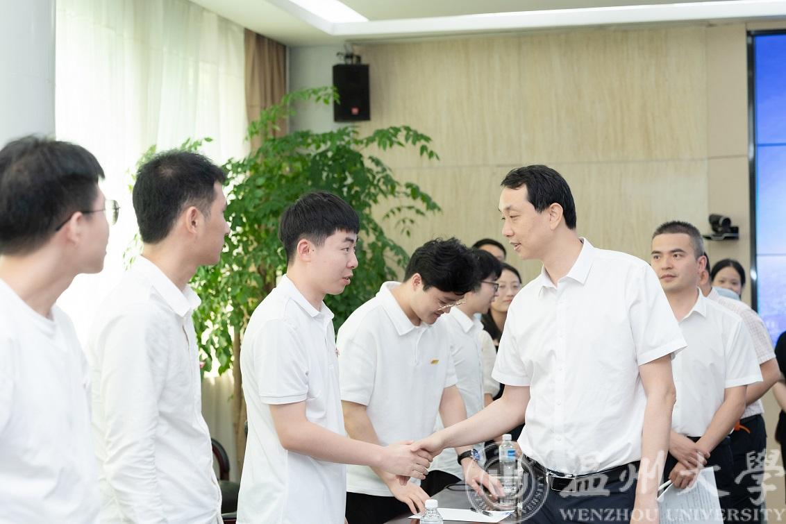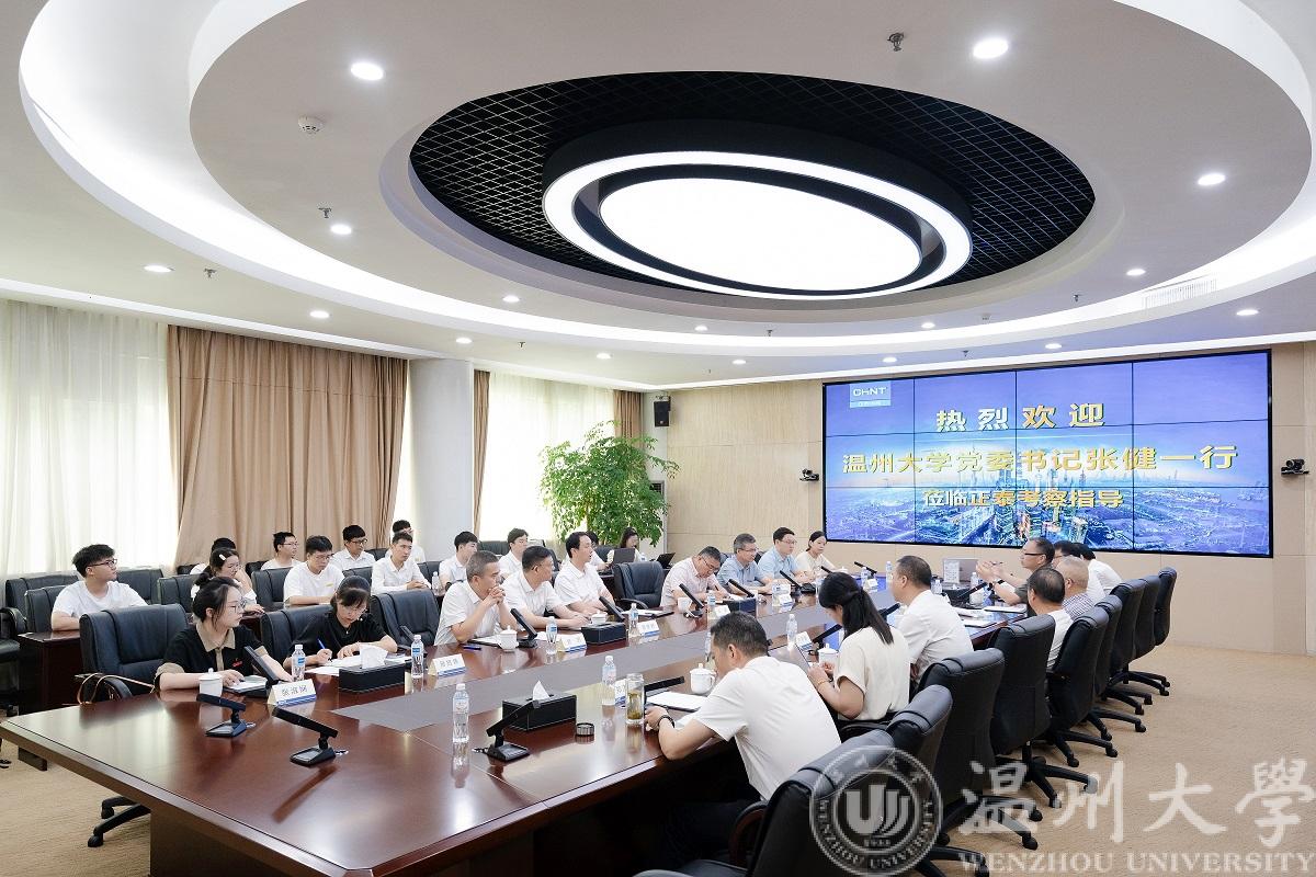 7月14日上午,温州大学党委书记张健来到正泰高科技工业园慰问球探体育比分网 “数字孪生技术”科创实践团队,乐清市副市长叶序锋,正泰集团党委书记、监事会主席吴炳池热情接待了张健书记一行。