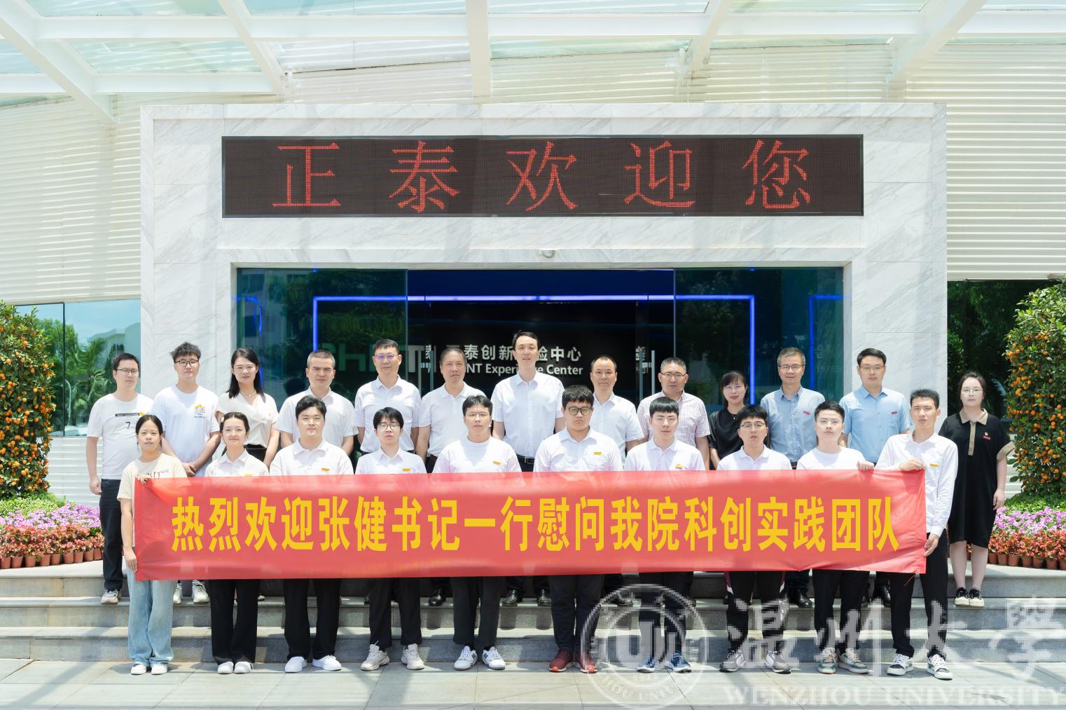 乐清团市委书记谢丞鸿、北白象镇党委书记郑济斌、温州大学党校办主任蔡联群、温州大学研究生部部长高红星、温州大学团委书记易招娣、球探体育比分网 党委书记李方强,温州大学乐清工业研究院院长、球探体育比分网 “数字孪生技术”科创实践团指导老师舒亮等陪同慰问。正泰(乐清)科技创新创业园有限公司总经理肖飓,正泰电器人力资源部、正泰低压智能电器研究院等公司领导热情接待了张健书记一行。