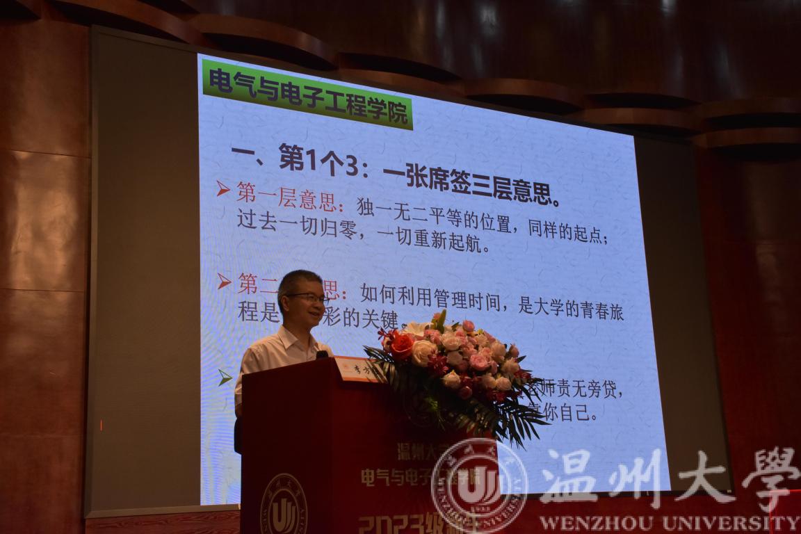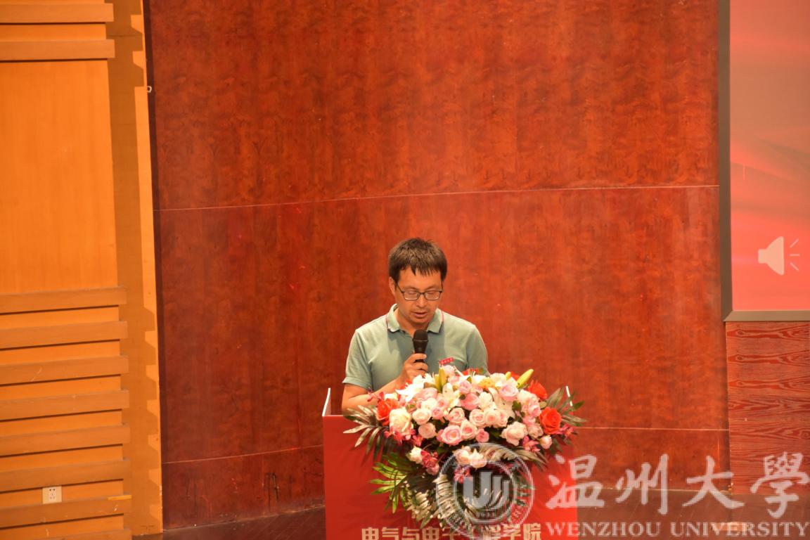 闫正兵老师作为教师代表上台发言。他希望同学们珍惜难得的大学时光,读万卷书,行万里路,在踏实求学的过程中,多了解温州,争取做到“学在温大,爱在温州”,他幽默风趣的发言赢得了现场热烈的掌声。