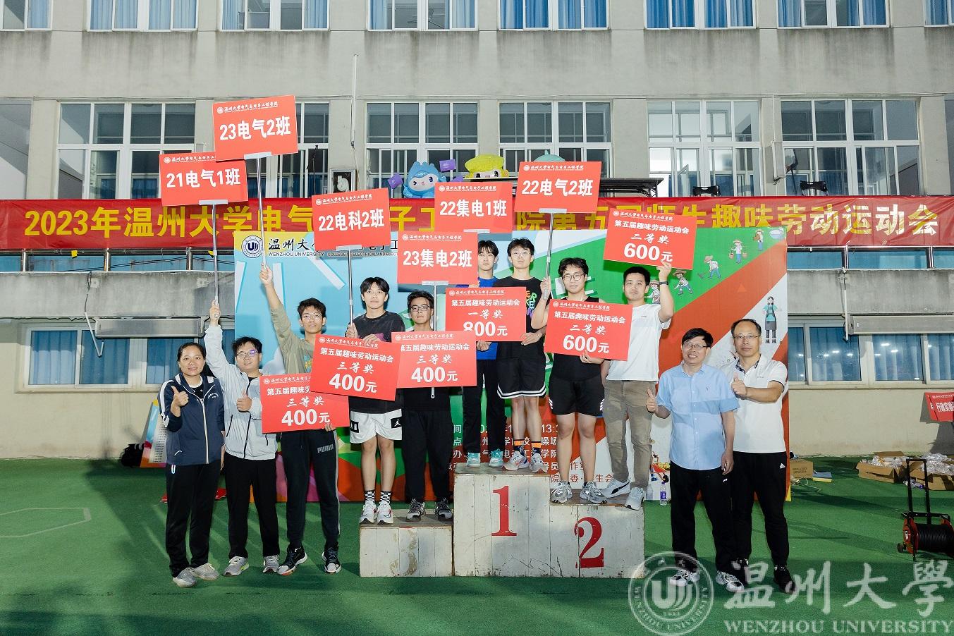全部比赛环节结束,就到了颁奖环节。球探足球 党委副书记曾蓓蕾,球探足球 电气系主任吴平,电子系主任庄友谊,为获奖班级颁奖。在美丽的夕阳下,为本届师生趣味劳动运动会画上了圆满的句号。