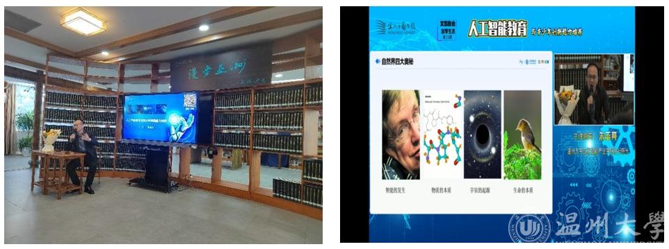 11月12号,球探体育比分网 朱志亮老师受邀在温州市图书馆开了一场《走近人工智能,探讨数智时代青少年创新能力培养》主题讲座。本次活动是温州市图书馆“文旅融合·智享生活”系列讲座之一,线上线下共计约7000来人参与了此次讲座。