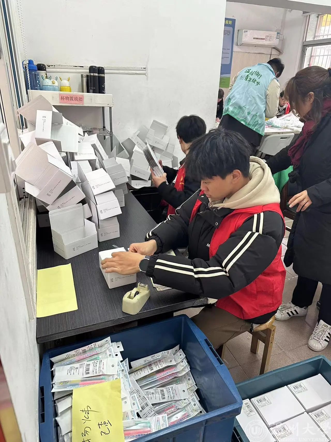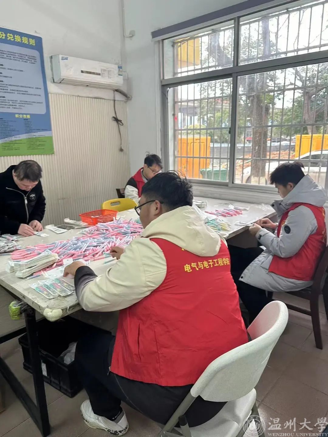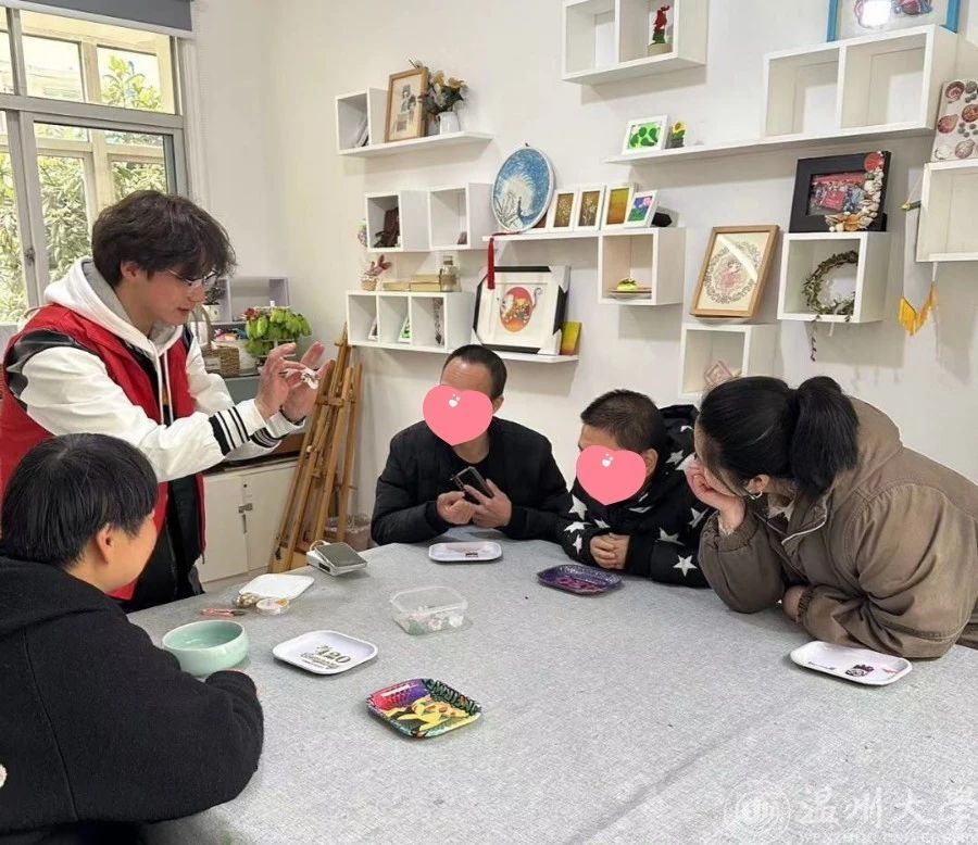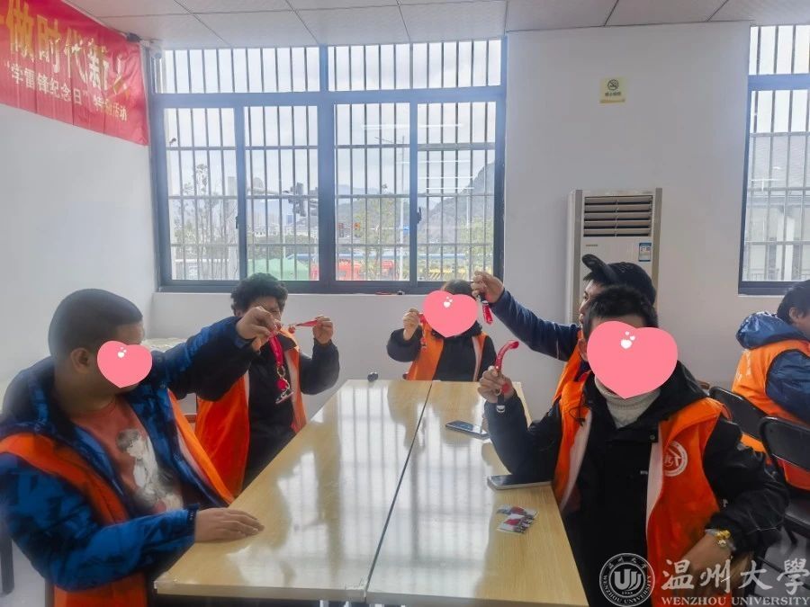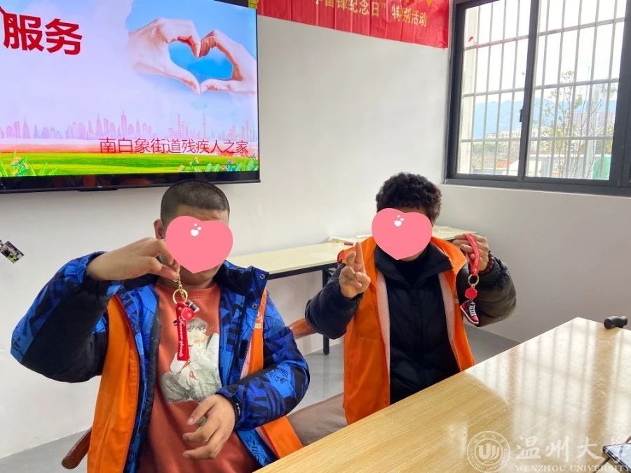 在龙湾区青苗残疾人之家,志愿者们还参与了残疾人的日常生活,和他们一同装笔、封盒、布置房间。在与残疾人亲切交流的过程中,志愿者们切实地了解他们的需求和困难,不断改进帮助方式,让残疾人感受到社会的温暖与关爱。志愿者们还分发了,温州大学单脚鞋银行的文创产品,看到他们脸上的笑容,同学们们感到温暖幸福。
