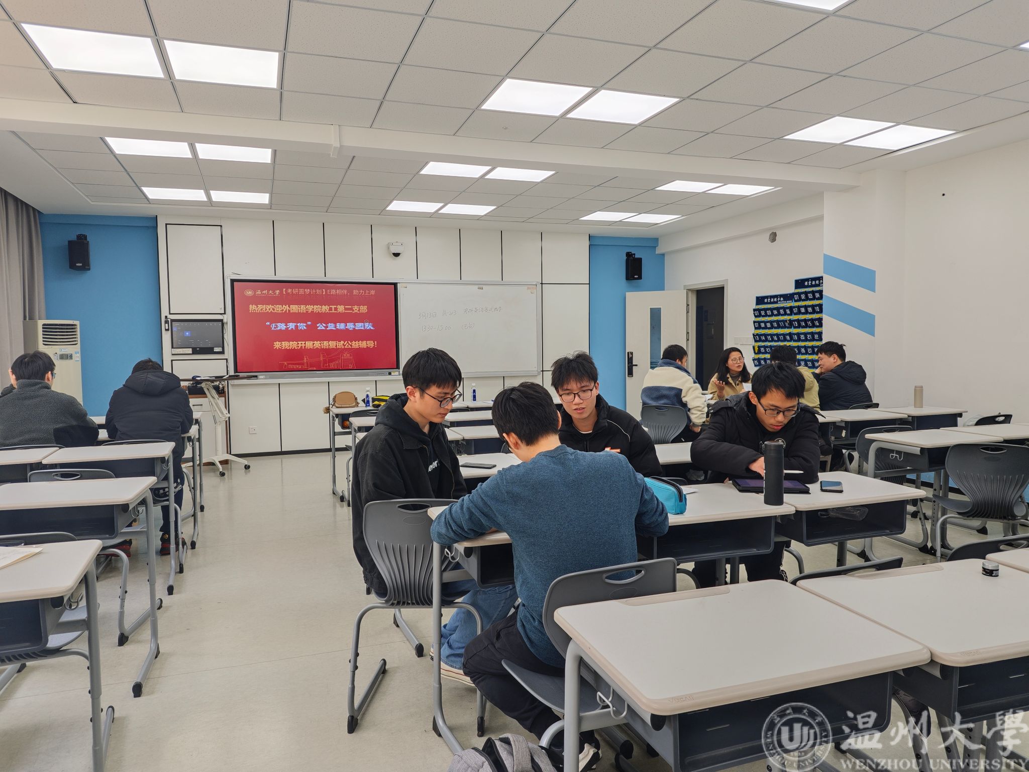 球探体育比分网 一直高度重视学生的考研准备工作,通过举办各类考研辅导、复试经验分享活动,为学生提供全方位的支持。近年来,外国语球探足球 教工第二党支部的“E路有你”公益辅导团队一直致力于指导球探体育比分网 学子考研英语复试,帮助他们顺利圆梦。去年,球探体育比分网 有十余名学生参与该团队王素娟老师两次英语复试的线上指导,助力十余位同学顺利上岸;3月13日下午,“E路有你”公益辅导团队叶小芳、苏玉洁、冯小芳和陈博栋四位老师,莅临球探体育比分网 为同学们提供线下考研英语复试指导。他们的有力指导让同学们对接下来的英语复试环节充满信心。