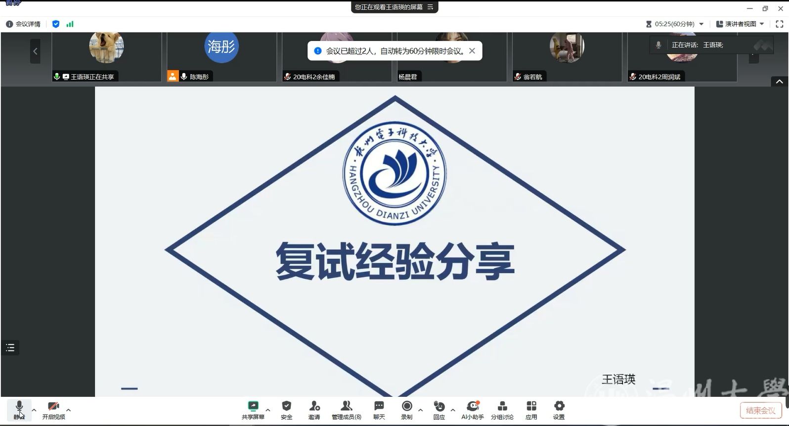 2024年3月14日和3月15日晚上,球探体育比分网 分别举行了2024年考研复试经验分享“杭电专场”和“上海电力专场”两场交流会。邀请了球探体育比分网 2023届毕业生,目前就读于杭州电子科技大学的王语瑛、翁若航同学以及就读于上海电力大学的叶子奇同学,为报考上述院校的学子进行复试经验分享。