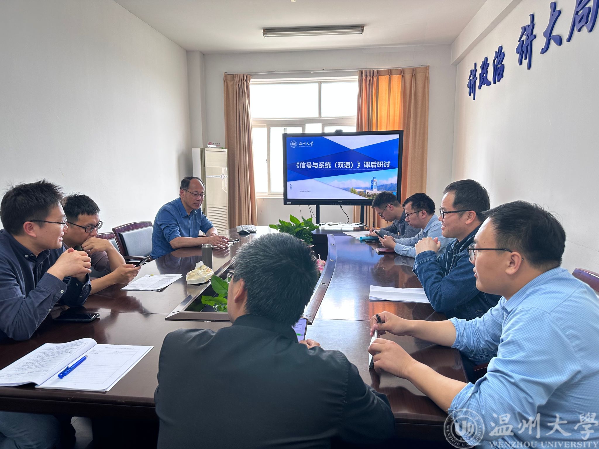 课后,听课老师们在1A502会议室进行了评课教研活动,电气系主任吴平老师组织了评课。老师们认为洪老师的课程准备充分、设计合理,与学生互动非常良好,PPT展示与板书步步结合,有助于学生巩固理解,课程思政融入自然;同时,老师们也针对课堂节奏掌控、例题讲解时间、雨课堂运用、双语教学形式等问题进行了探讨。