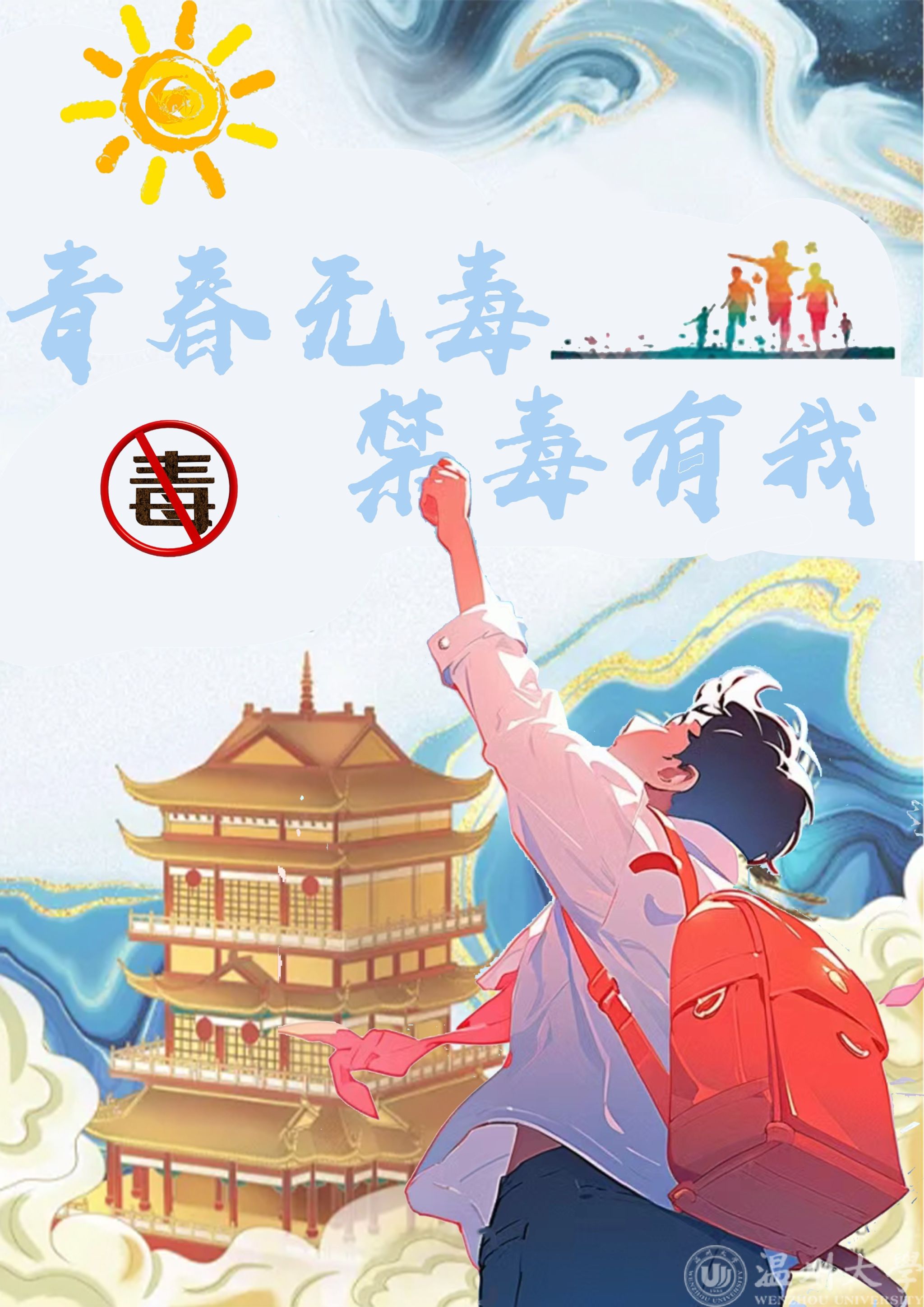 (青春无毒,阳光逐梦——22电科1班周羿成。此海报以青春阳光为主要元素,画面正中为一位青春活力的少年,伸长了双手去逐日逐梦的画面,寓意了大学生群体应当怀揣梦想,一心向阳,向未来进发,扫除道路上的邪恶诱惑)