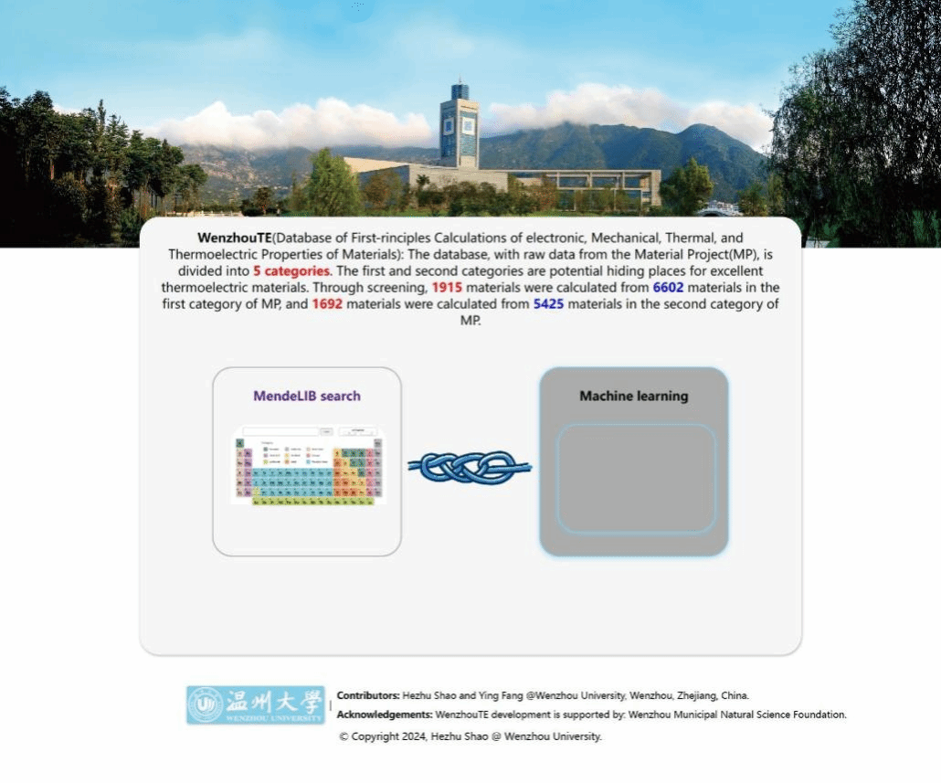 该工作得到温州市基础性工业科研项目(项目名称:基于材料基因组方法的高性能热电材料开发,项目号G20210016,项目经费:10万元人民币,其中财政支持5万元人民币,自筹5万元人民币,项目起止时间2022.1至2024年.12)的支持,另外球探体育比分网 也为课题组在计算服务器(目前建有10个计算节点)搭建上提供了大力支持,因而该材料数据库命名为“温州热电”(Wenzhou TE)。