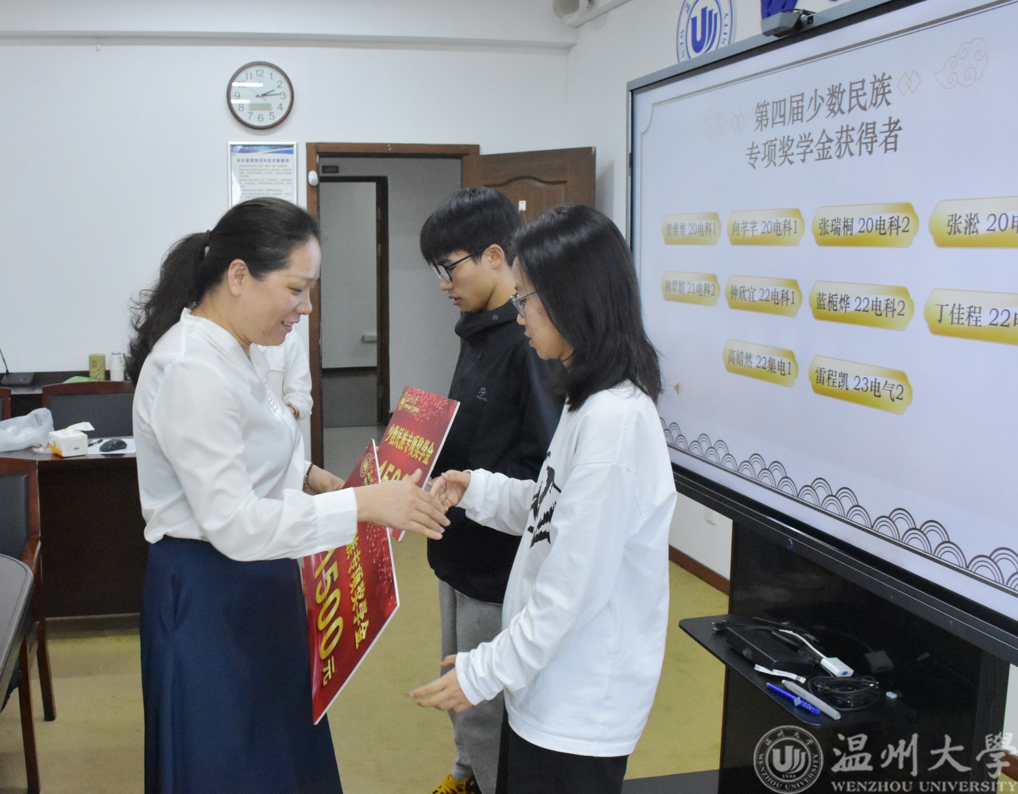 会议伊始,陈海彤老师向在座同学介绍了少数民族专项奖助学金的设立及评奖情况。随后曾蓓蕾书记为获得第四届少数民族学生专项奖学金的10位同学颁奖以及临时困难补助的2位同学颁奖,廖晓安老师为获得少数民族学生专项助学金的10位同学颁奖。