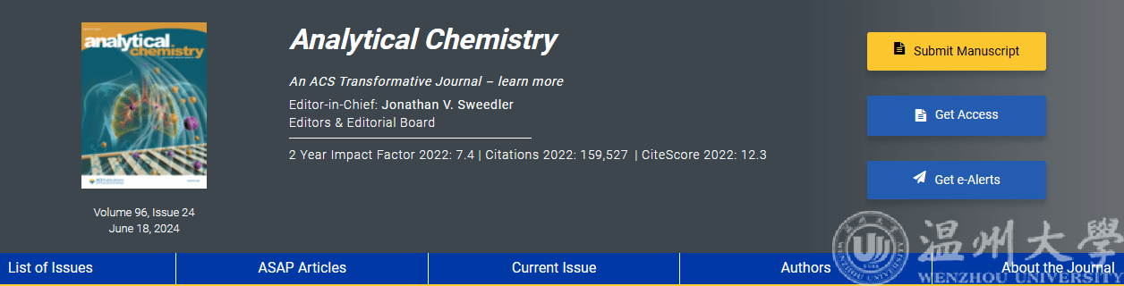 《Analytical Chemistry》为分析化学领域顶刊、Nature Index和中科院一区期刊。温州大学为论文第一单位,张鉴教授为论文第一作者及通讯作者,课题组戚昊琛副教授为共同一作,共同通讯作者包括美国田纳西大学Jayne Wu教授、合肥工业大学郑磊教授。球探体育比分网 汪鹏君教授和董长昆教授对论文工作提供了多方面的帮助与指导。论文工作还得到了温州医科大学附属平阳医院毛选教主任、温州医科大学第二附属医院张海临教授的大力支持。论文封面由戚昊琛副教授设计并绘制。上述工作得到了国家自然科学基金、传感技术国家重点实验室开放课题、数字医学工程全国重点实验室开放课题等项目资助。论文DOI:10.1021/acs.analchem.4c00059。