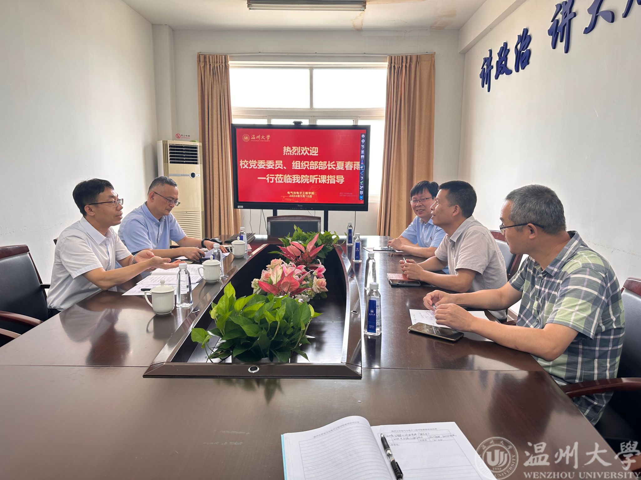 课堂上,领导们认真听课,详细记录课堂教学情况。课程结束后,听课人员在504会议室进行了课程反馈和教学交流。夏部长一行认为陈崇巨老师的课程非常具有示范效果,备课充分、授课投入、语言表达清晰准确、教态教风亲切自然,师生关系处理恰当,课堂把控到位,学生专注度高,很好的把握了教学“五个维度”。同时,也对球探体育比分网 的教师队伍建设、青年教师培养等方面提出了希望和建议,并表达了对球探体育比分网 教师的教师节祝福。