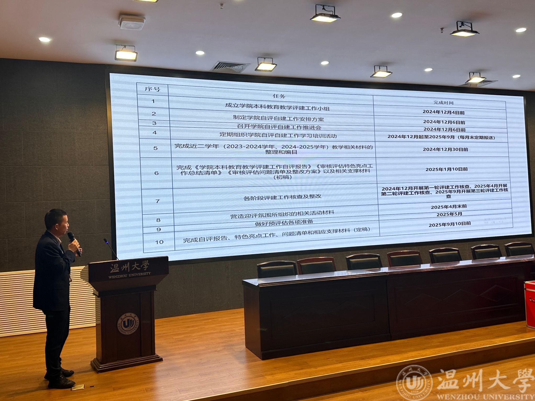 会上,陈孝敬副院长首先强调审核评估是对球探足球 本科教育教学工作的又一次重要检验,全体师生要高度重视,凝聚共识,全力以赴;同时,他传达了学校本科教育教学审核评估评建工作推进会相关精神,并结合《温州大学本科教育教学审核评估实施方案与工作手册》,对学校下发的审核评估相关任务进行了详细解读和工作部署,内容包括:自评报告撰写、支撑材料建档、教学材料整理、管理文件编制等多个方面,他强调各系部、专业、科室对标《温州大学普通高等学校本科教育教学审核评估指标体系》要求,科学合理分解任务,严格按照时间节点落实,理清评估工作思路,强化迎评行动措施。