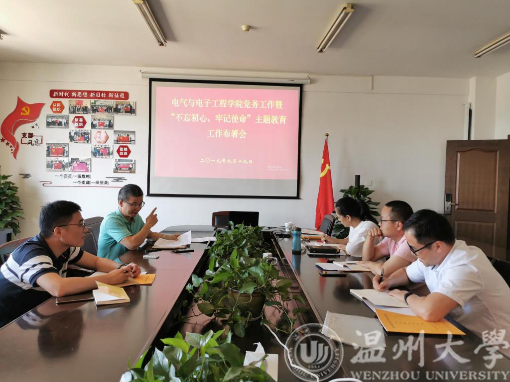 会议重点布置了“不忘初心,牢记使命”主题教育工作。李书记说,开展主题教育,是深入学习贯彻落实习近平新时代中国特色社会主义思想、加强理论武装的迫切需要,是推进党的建设的迫切需要,大家要充分认识到开展主题教育的重要意义,切实增强开展好主题教育的思想自觉、政治自觉、行动自觉。会上,李书记带领支部书记仔细研读了学校组织部印发的《中共温州大学委员会“不忘初心、牢记使命”主题教育工作计划表》,并充分讨论,形成了“每天多学半小时”、“学习强国勤打卡”、“会址研学”、“集体答题会”等主题教育学习形式,李书记强调,要结合建国七十周年,把主题教育开展得有深度、更入心。