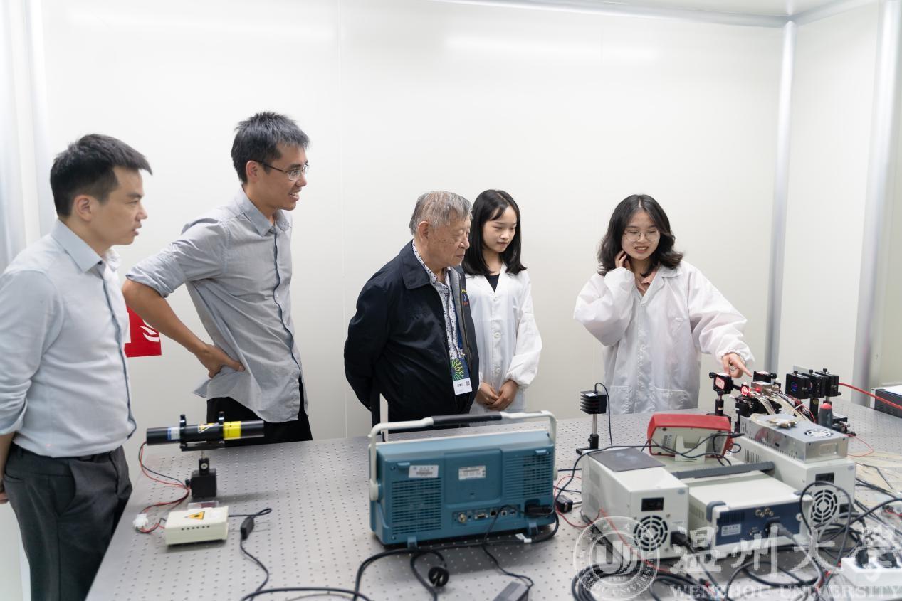10月25日,应我校团委和激光与光电子技术研究所朱海永团队邀请,深圳大学范滇元院士和许长文博士莅临我校指导。范院士一行来学校后,在朱海永和段延敏老师的陪同下来到激光超净实验室参观。在听了朱老师对实验室的介绍后,范院士对课题组同学的实验进行了现场指导并提出了宝贵意见。随后在南校区1号楼A502会议室进行了座谈交流。校党委庄兴忠副书记,球探体育比分网 李方强书记、曾蓓蕾副书记,数理球探足球 高利新院长、何林李副院长,校团委丁强副书记,激光与光电子技术研究所的所有师生参与了座谈。范院士对激光发展现状和展望做了高瞻远瞩的介绍,并在听取同学们对挑战杯作品的汇报后给予指导和鼓励,现场的老师和同学们都表示受益匪浅。