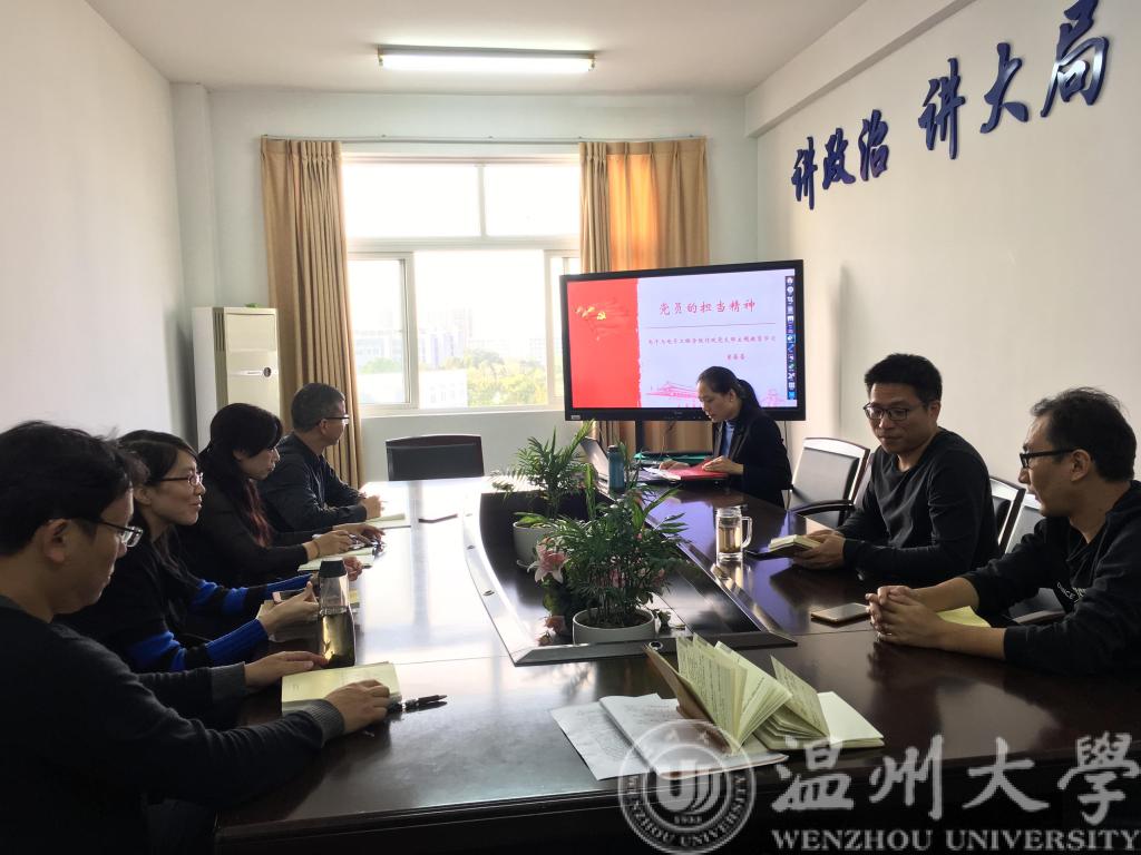 10月30日下午,球探体育比分网 行政教工党支部“不忘初心、牢记使命”集中学习会在球探足球 1A504会议室召开,支部书记曾蓓蕾为支部党员作题为《党员的担当精神》主题教育专题党课。