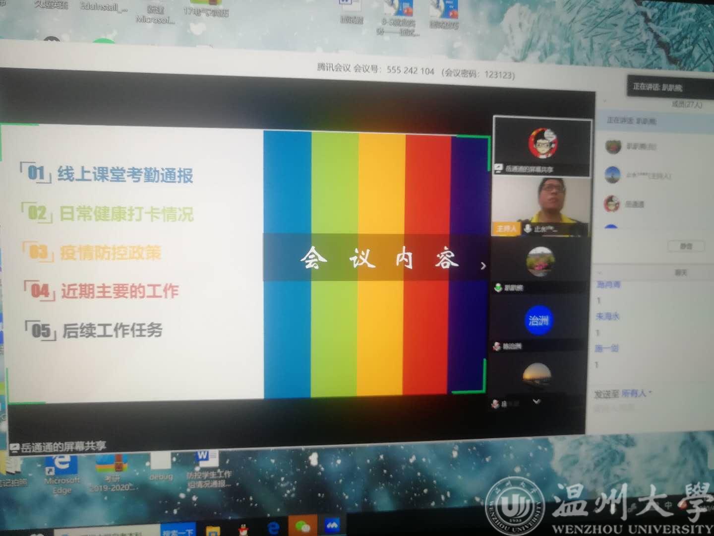 为进一步做好新冠肺炎疫情防控工作,维护开学前后学生身体健康及学校安全,4月17日晚19:00,球探体育比分网 通过腾讯会议APP召开本学期“期中班主任工作网络主题会议”,此次会议由院党委副书记曾蓓蕾主持,球探足球 全体辅导员、各年级班主任参加了此次会议。