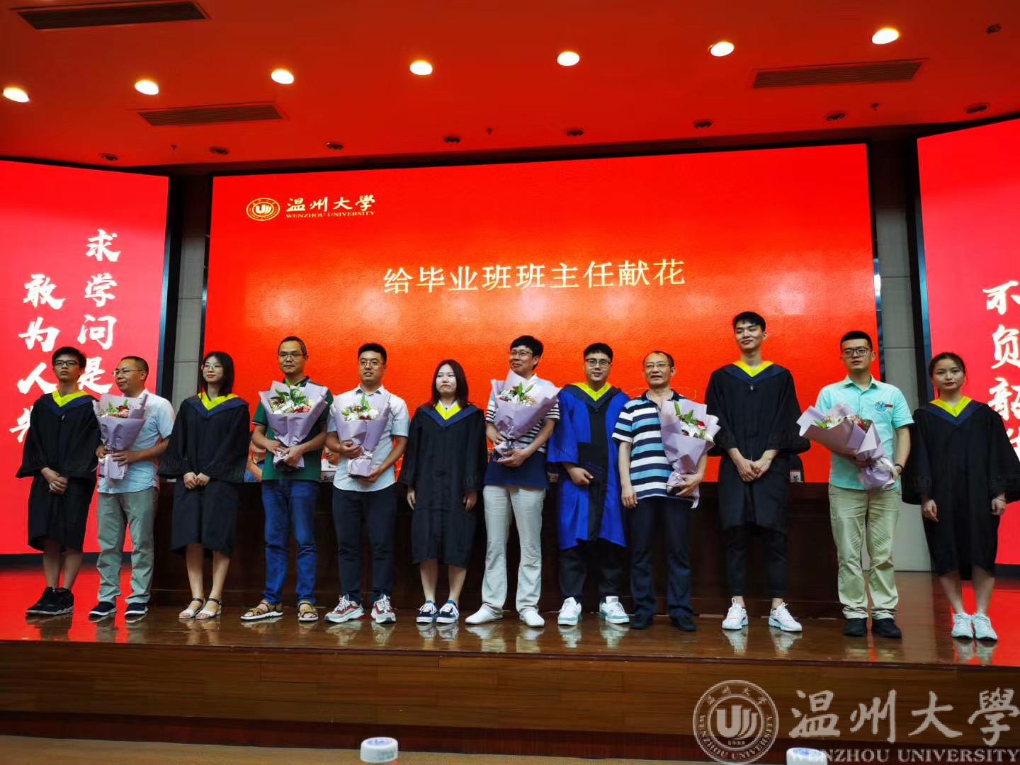 紧接着,由学生代表给毕业班班主任献花。学生代表们身着学士服,手捧美丽的鲜花走上舞台,将最美的鲜花送给毕业班班主任老师,感谢他们四年来辛勤的付出;
