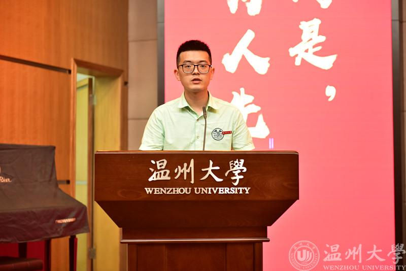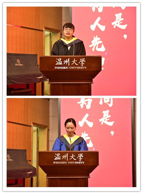最后进行的是对省、校优秀毕业生的表彰,由副院长朱翔鸥宣读表彰名单,研究生张佳瑶、本科生俞珠颖分别作为研究生代表和本科生代表,依次上台发言。