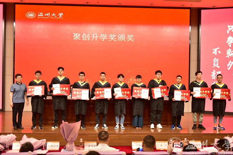 毕业典礼的第二环节,进入聚创升学奖颁奖仪式,由副院长陈孝敬宣读获奖名单,聚创公司董事长、球探足球 资深教授吴桂初老师对获奖同学(共58人)一一进行颁奖。