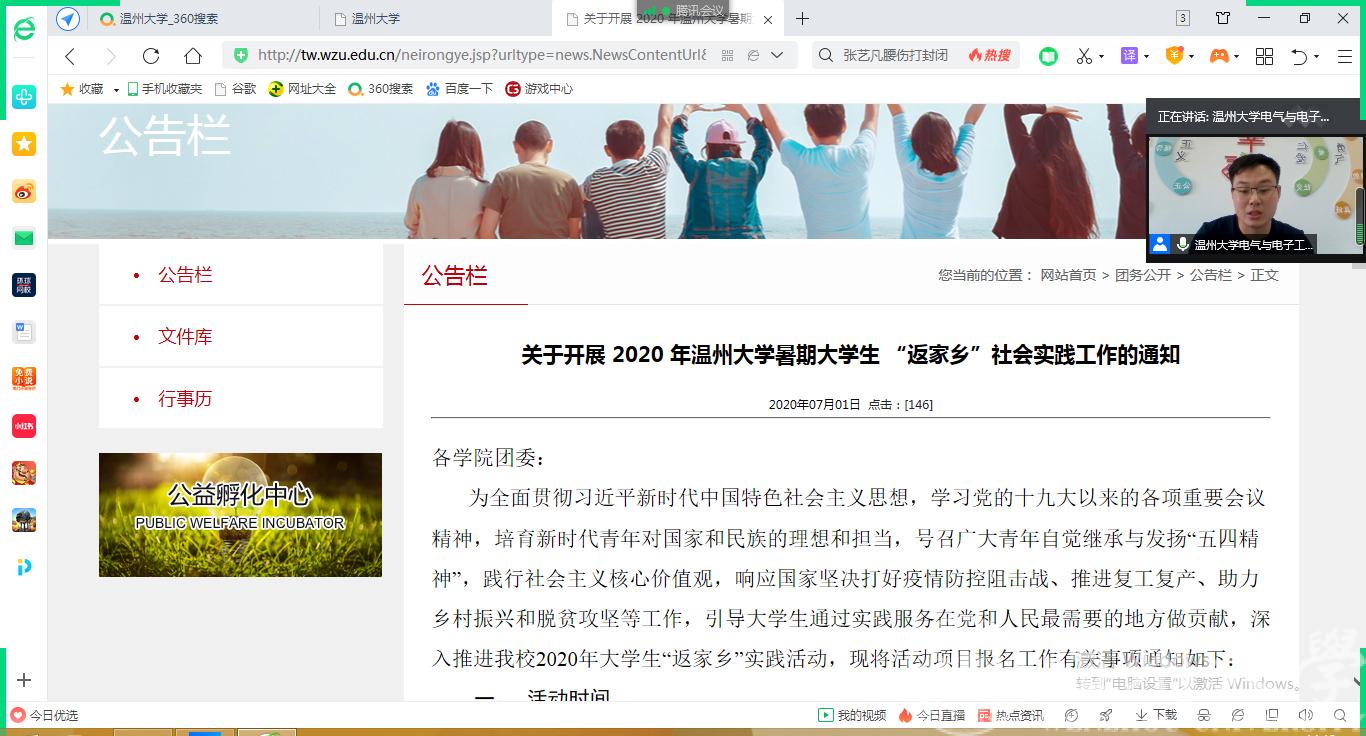 为进一步落实《关于开展2020年温州大学暑期大学生“返家乡”社会实践(“挑战杯”创新创业专项)工作的通知》要求,鼓励大学生暑假期间积极投身“返家乡”社会实践,7月5日下午14:00,球探体育比分网 召开2020年暑期大学生“返家乡”社会实践(“挑战杯”创新创业专项)工作线上答疑会。此次线上答疑会由球探体育比分网 负责团学工作的学工办辅导员潘龙飞老师组织,2019级全体本科生、部分未参加暑期社会实践的2018级、2017级本科生参加了此次会议。