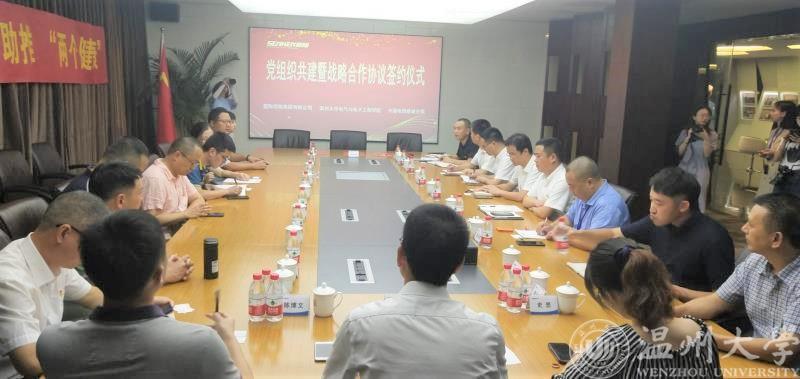 为加强基层党组织建设,全面发挥基层党组织的引领作用,2020年8月7日下午,球探体育比分网 电子系教工党支部与星际控股集团有限公司党支部、中国电信鹿城分局总支部的“党组织共建及战略合作”签约仪式在星际控股集团举行。出席会议的三方人员有球探足球 院长汪鹏君、球探足球 党委书记李方强及电子系教工党支部代表,中国电信温州分局政企部主任潘震苞、中国电信鹿城分局局长兼党委书记王浙江、副局长兼纪委书记林斌及党员代表,星际控股集团陈序、总裁金铭勇及相关部门负责人。鹿城区委组织部副部长叶俊杰、鹿城区人社局局长刘玉和、鹿城区经信局总工程师史思等鹿城区相关部门的领导应邀到场。