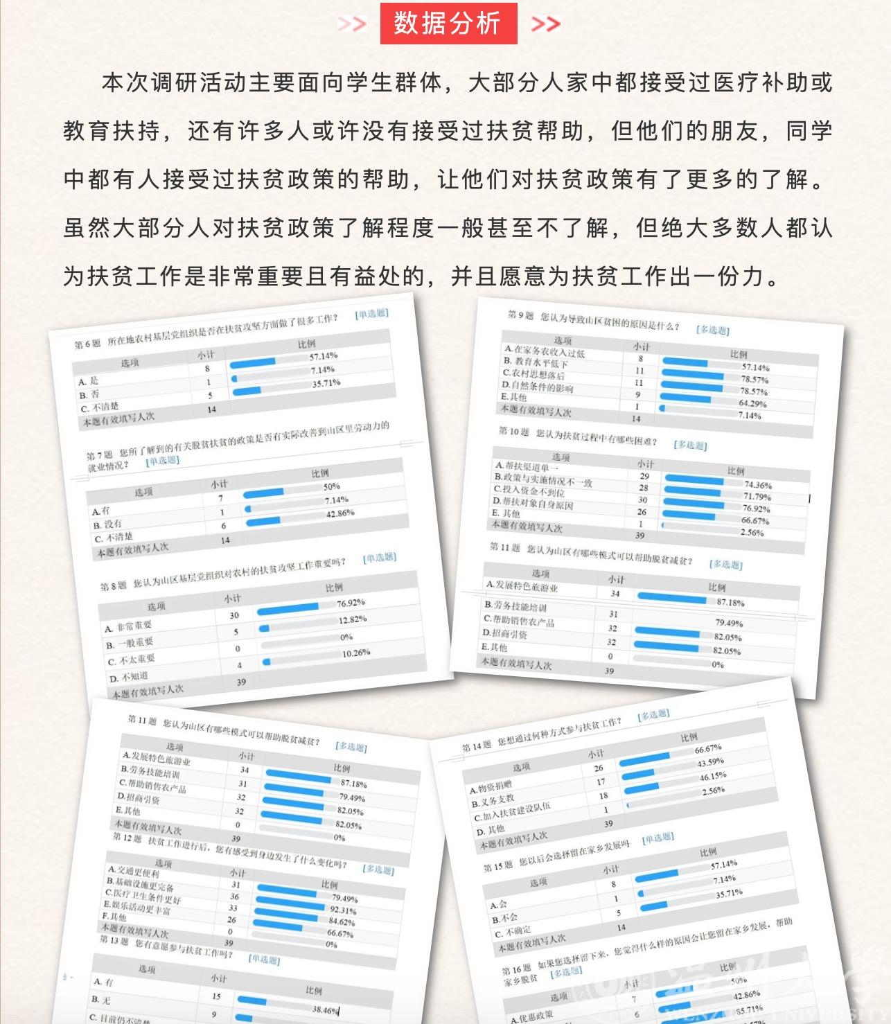 2020年8月8日,球探体育比分网 第一届“益行”暑期社会实践队关于山区扶贫线上调研活动圆满完成。为引导人们关注贫困问题、关爱贫困人口、关心扶贫工作,营造“人人皆愿为”的社会扶贫氛围,弘扬“人人皆可为”的公众扶贫理念,体验“人人皆能为”的参与扶贫机制,也为了“益行”暑期实践队后续活动更好的展开,实践队线上全体成员开展了关于山区扶贫的线上调研活动,旨在通过线上调研活动,分析人们对于扶贫工作的了解程度,让更多的人关注扶贫工作,参与扶贫工作中来。