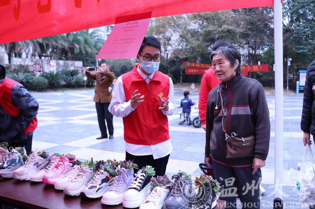 12月5日上午,志愿者们早早地将物资搬运到学校不远的博园社区,在博园文化广场将盆栽进行义卖。每当有居民向鞋子们走来,志愿者们都会一一为他们介绍此项目的意义。本次活动受到了社区居民和孩子们的大量热烈欢迎,他们也纷纷对单脚鞋银行项目表示肯定。此次活动最终收获的义卖资金,也将作为后期单脚鞋银行项目运转的费用,让单脚鞋项目走得更长更远。