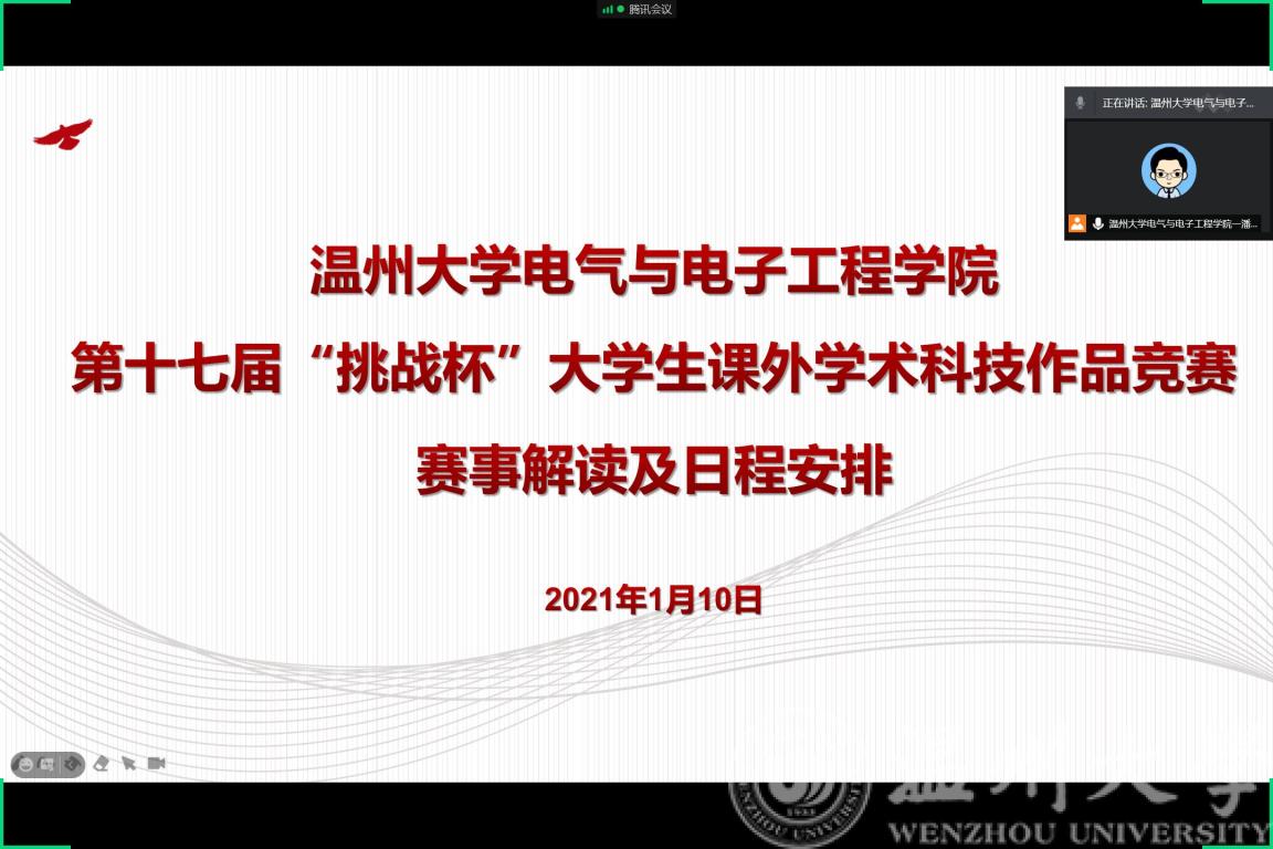 为及时传达1月8日校团委召开的“第十七届‘挑战杯’大学生课外学术科技作品竞赛赛事动员大会”的会议精神,进一步提高球探体育比分网 师生参与大赛的热情,更好的为师生答疑解惑,1月10日晚18:30,球探体育比分网 召开“第十七届‘挑战杯’大学生课外学术科技作品竞赛赛事解读及日程安排”线上会议。球探足球 院长汪鹏君、党委副书记曾蓓蕾,及预参赛项目的学生和部分指导老师参与了此次会议,会议由球探足球 负责科创工作的辅导员潘龙飞主持。