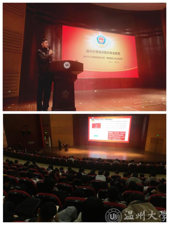 2021年4月14日下午,球探体育比分网 于南校音乐厅面向全体19级与20级学生举行了“反诈防诈网络安全教育”主题讲座。本次讲座邀请到了温州市公安局瓯海区分局高教园区茶山派出所的周文涛警官向同学们进行防诈反诈的安全教育。