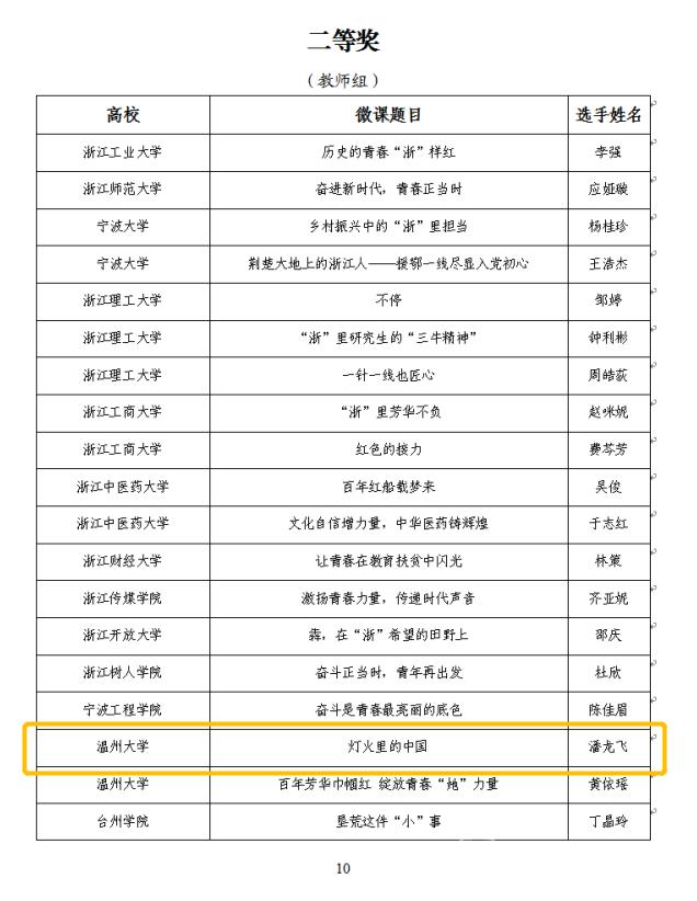 近日,由共青团浙江省委、浙江省教育厅、浙江省学生联合会主办的2020年度浙江省高校思政微课大赛获奖名单公布,球探体育比分网 辅导员潘龙飞老师的思政微课作品《灯火里的中国》荣获此次微党课大赛二等奖。
