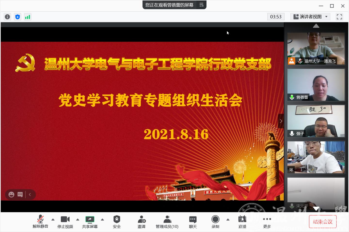 根据市和学校党史学习教育领导小组部署要求:“七一”后基层党组织要围绕“学党史、悟思想、办实事、开新局”为主题,认真贯彻“学史明理、学史增信、学史崇德、学习力行”要求,以党支部为单位,组织党员召开一次专题组织生活会,交流学习体会,查找差距不足,引导广大党员不断增强“四个意识”、坚定“四个自信”、做到“两个维护”。8月16日上午9:00,球探体育比分网 行政教工党支部召开党史学习教育专题线上组织生活会。