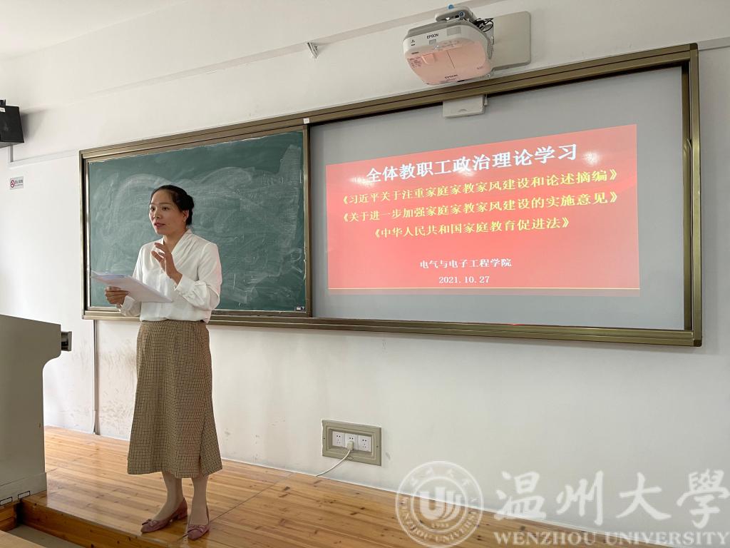 会议伊始,球探足球 党委副书记曾蓓蕾带领全体教师学习了文件《习近平关于注重家庭家教家风建设和论述摘编》《关于进一步加强家庭家教家风建设的实施意见》《中华人民共和国家庭教育促进法》,提出家庭是社会的基本细胞,家庭建设是社会进步和国家发展的重要基础,家风建设是完善国家治理的重要依托。接着球探足球 党委书记李方强为全体教工补充学习了黄大年事迹和浙江省委、温州市委相关会议精神。