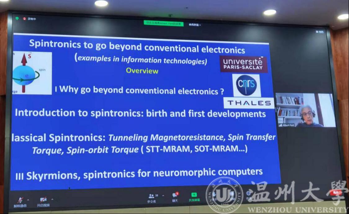 2021年10月25日下午,2021年世界青年科学家峰会科学大使活动费尔教授诺奖报告会在我校岩松堂雁山厅举行。本次报告会,以我校为主会场,北京航空航天大学、浙江大学为分会场,采用现场会议+视频联线仪式,通过线上线下结合形式举行。我校球探体育比分网 负责主会场活动。主报告人,2007年诺贝尔物理学奖获得者、法国科球探足球 院士、巴黎萨克雷大学教授、自旋电子学创始人、世界级物理学家,阿尔贝•费尔(Albert Fert)教授为大家带来了题为《自旋电子学——超越信息技术时代的传统电子学》的专题报告。