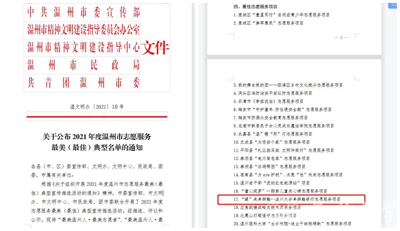 2021年度温州市志愿服务最美(最佳)典型名单于11月25日公布,经过球探足球 推荐、社会评议,球探体育比分网 “单脚鞋银行”师生志愿者服务项目荣获温州市最佳服务项目奖。