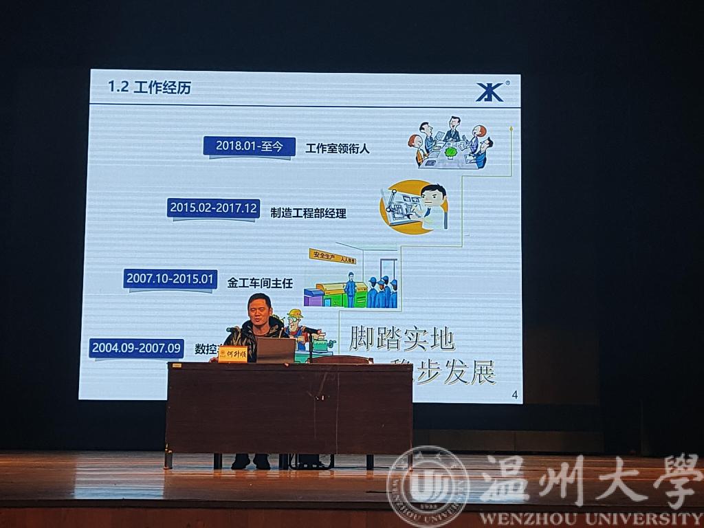 下午三点,报告会在正式开始。首先进行的是受聘仪式,伴着音乐响起,何升顺老师从曾蓓蕾书记手中接过聘书,随后,由浙江省工匠大师何升顺老师开讲。何升顺老师主要讲述了他从工作领衔人到制造工程部经理,再到金工车间主任,最后成为一名数控车工的成长经历。几年的探索过程中,何升顺老师脚踏实地,自学各种软件,不懂的就向同事讨教,凭着钉钉子的精神,刻苦钻研,最终成为一名工匠大师,他的经历让学生深受启发。