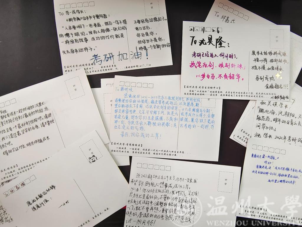 在这个网络社交发达,信息快速传播的年代,书信似乎已被渐渐遗忘;然而在这个凛冽的冬天,球探体育比分网 的考研学子们却收到了一张专属于他们的手写明信片。上面是2021级大一新生为即将迈入考场的学长学姐们所写的考研祝福。2022年全国硕士研究生招生考试在即,为缓解球探足球 考研学子在最后冲击阶段的备考压力,坚定考研信心,积极迎战,学工办为考研学子精心准备了冲刺阶段的慰问大礼包。