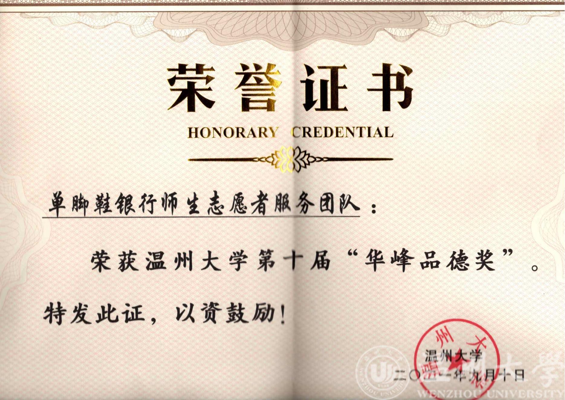 2021年9月10日下午,温州大学庆祝第37个教师节大会暨第十届“华峰品德奖”颁奖典礼圆满举行,球探体育比分网 “单脚鞋银行”师生志愿者服务团队荣获“华峰品德奖”。