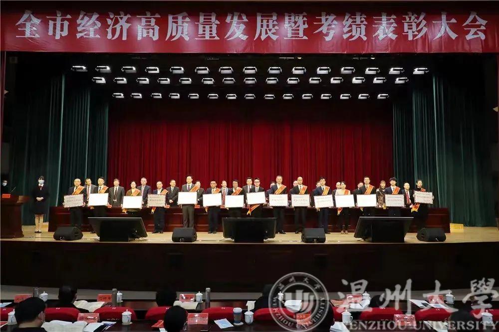 会议观看了《乐清市经济高质量发展专题片》,表彰了考绩优秀单位、先进企业及2021年政策兑现项目相关企业。会上公布的多个荣誉榜单中,温州大学乐清工业研究院在“温州市高能级创新平台”榜单光荣上榜,研究院院长林振权上台接受乐清市政府颁发荣誉奖牌。市委书记徐建兵充分肯定了过去一年各先进部门、企业的成绩,鼓舞广大企业勇于担当,积极贡献。