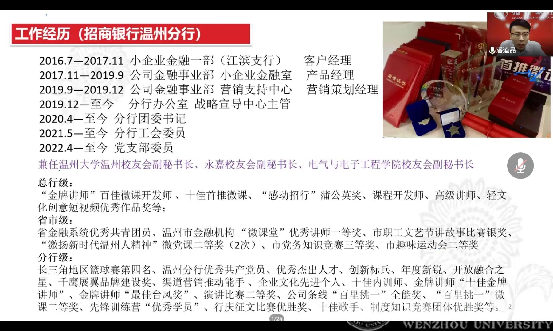 潘道品校友系球探体育比分网 2012级电气工程及其自动化专业本科生,在校期间曾担任温州市学生联合会执行主席、温州大学团委副书记、温州大学步青学区文体部部长等学生干部职务。他现就职于招商银行温州分行,担任招商银行温州分行办公室主管、团委书记、工会委员、总行高级讲师等职,同时兼任温州大学温州校友会副秘书长、永嘉校友会副秘书长、球探体育比分网 校友会副秘书长。